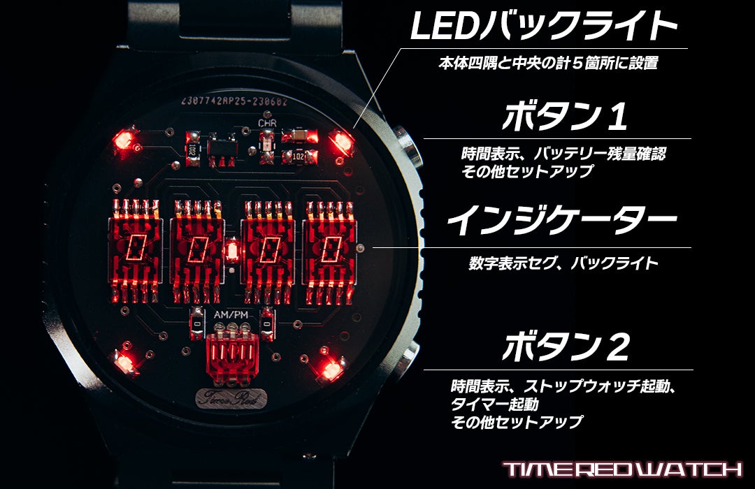 ボタン押下でセグが動き出し、起動時に光るバックライトがレトロでメカニクルなTIME REDの雰囲気をさらに高めてくれます。