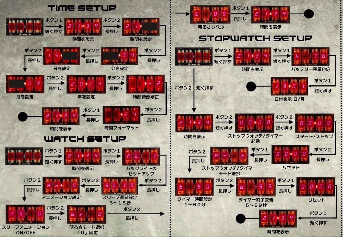 本体のボタンを操作して日付/時間設定、12/24時間表示、アニメーションパターン、スリープ遅延時間、バックライトのON/OFF、光量、ストップウォッチ起動、タイマー設定といった多くの設定を行っていきます。