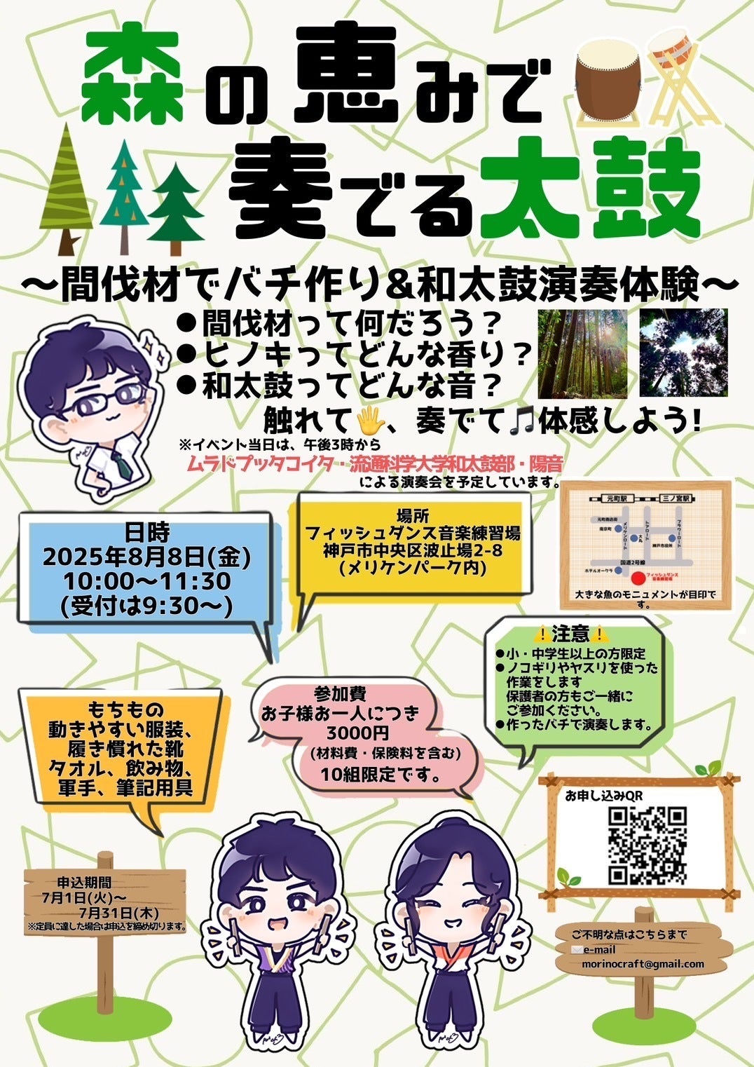 イベント当日は、子どもたちがノコギリやヤスリを使って自らバチを手作りし、地元演奏者や学生と共に和太鼓の音を響かせるワークショップを実施します。午後には、プロの太鼓奏者による演奏会も予定しており、自然素材から生まれた音が身体に響く、特別な体験が待っています。