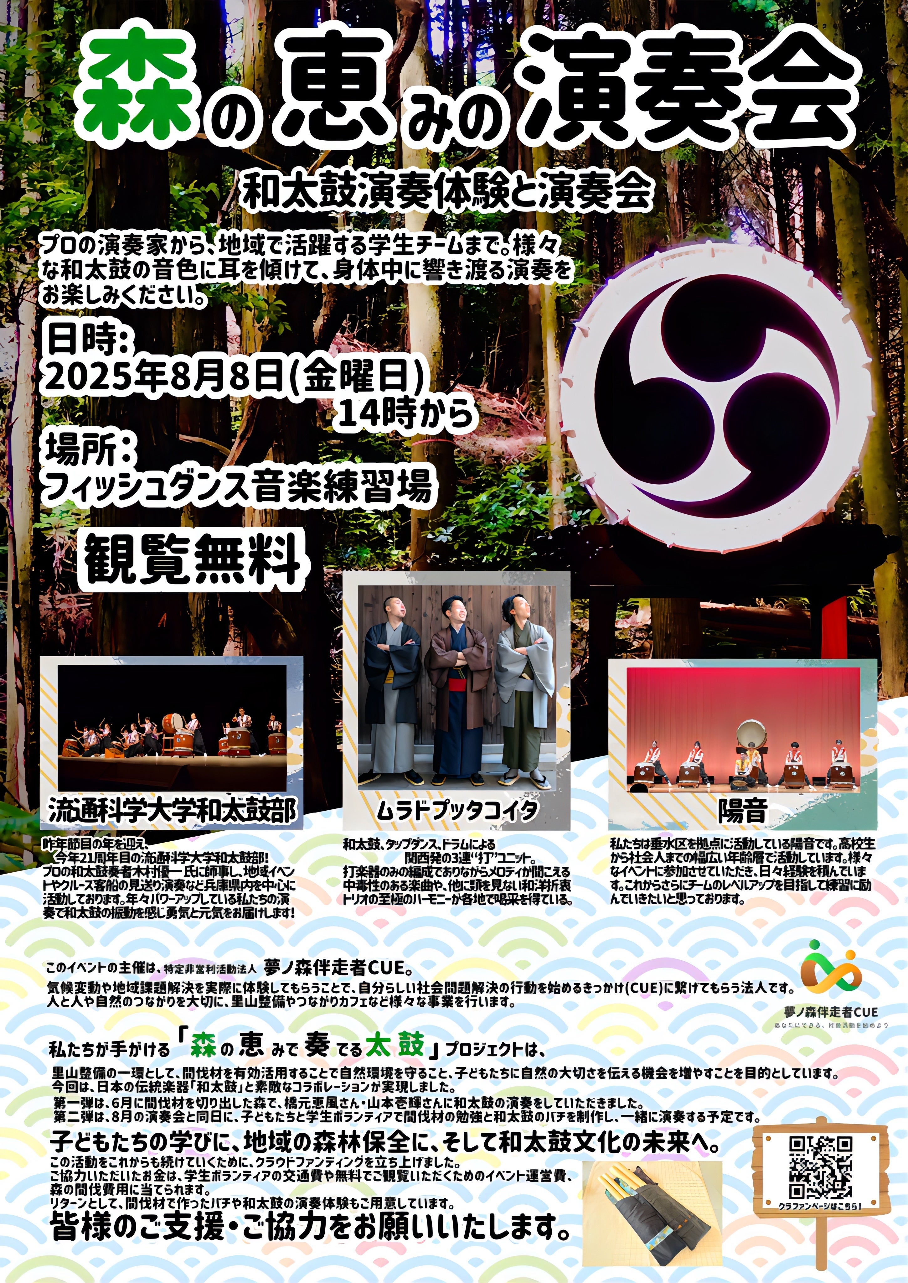 広報面では、InstagramをはじめとしたSNS投稿を強化し、地元和太鼓団体や子ども向け教室へのチラシ配布も実施。さらに、夢前町の森で行われた演奏撮影イベントの映像も、現在編集中であり、完成次第オンラインで公開予定です。