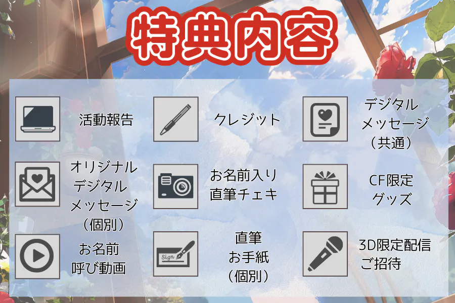 ・限定配信などやり取りの中で公序良俗に反する発言をされた場合、終了させていただく場合がございます。この場合の返金はございません・3Dモデルの完成時期につきまして、当初は2026年1月を予定しておりましたが、制作進行の都合により、2026年4月頃に変更となりました。楽しみにお待ちいただいているところ誠に恐れ入りますが、何卒ご理解いただけますと幸いです。(2025/7/31更新)
