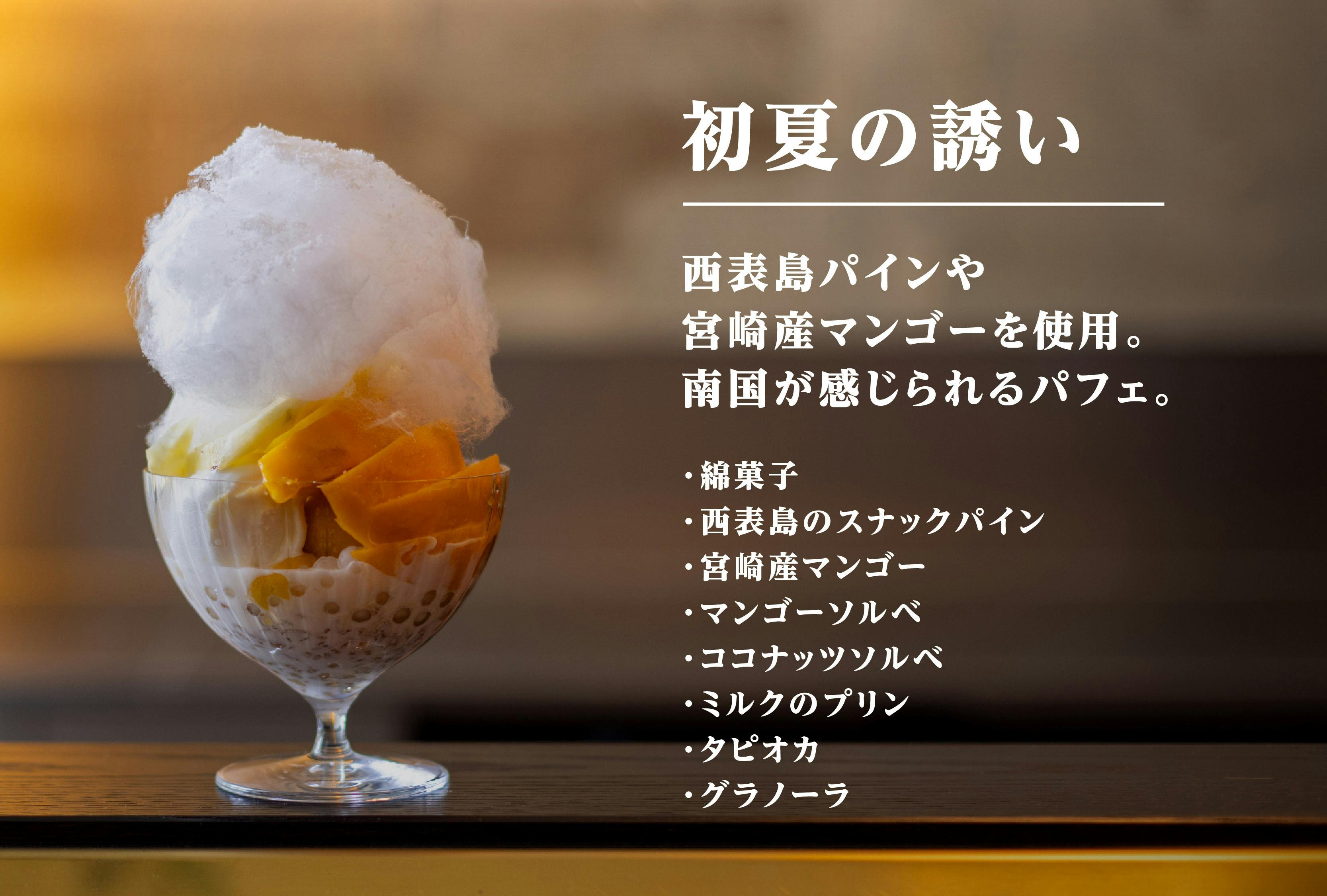 陽光をたっぷり浴びた南国の果実が、とろけるような甘さとともに広がるパフェ。西表島のスナックパインと宮崎産マンゴーを贅沢に使い、ココナッツとマンゴーのソルベ、ミルクプリンやタピオカが食感のアクセントに。ふわりと綿菓子を崩す瞬間からはじまる、トロピカルな記憶の旅へ──。酸味、甘み、香ばしさが重なり合い、物語のように展開していきます。