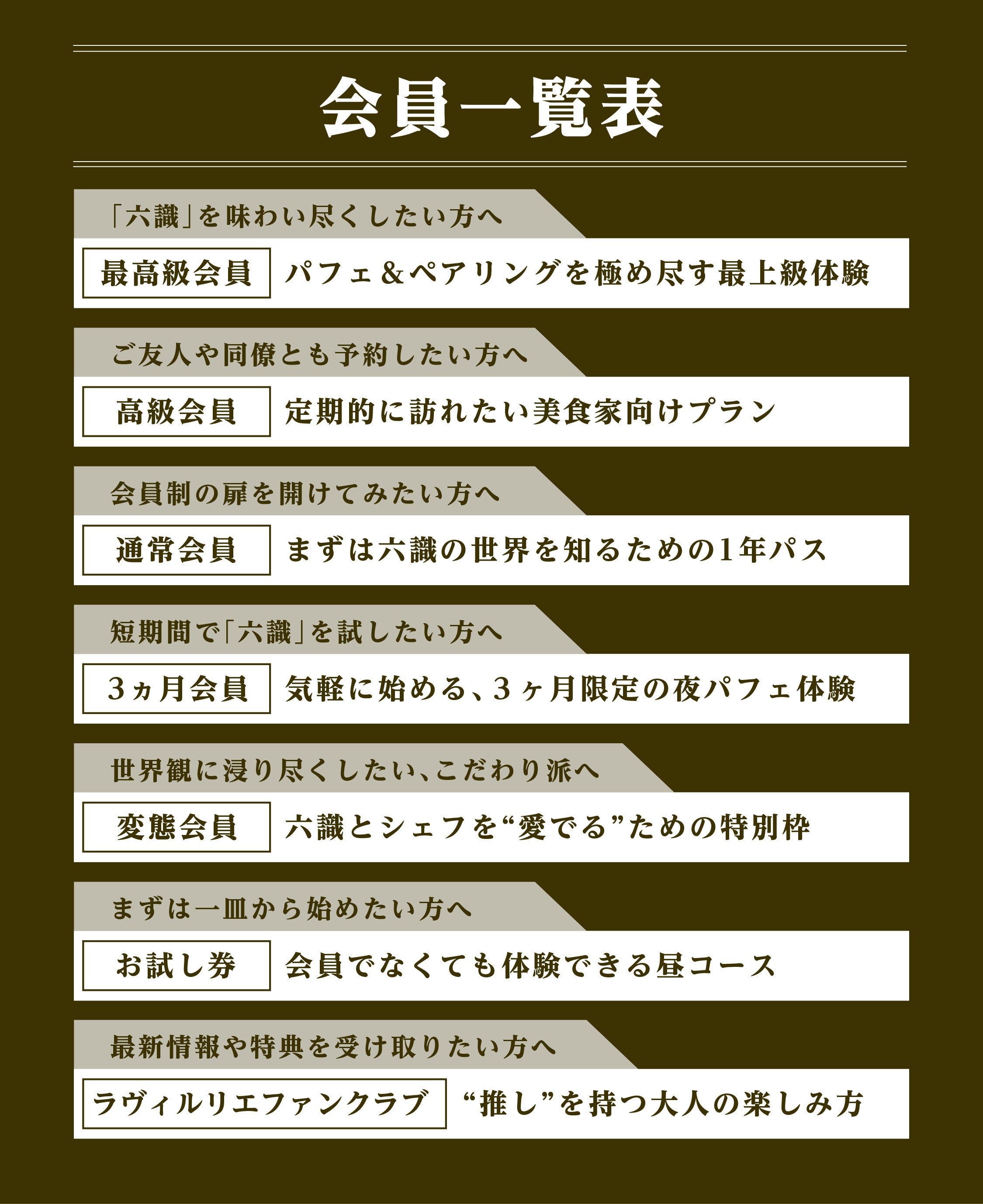 六識では、お客様のライフスタイルに合わせて選べる、多彩な会員制度をご用意しています。完全予約制の「昼コース」や「夜のパフェ体験」を、よりスムーズかつ特別に楽しめるのはもちろん、ここでしか味わえない特典を多数ご用意。ご自身のペースで贅沢を愉しみたい方から、特別な日に貸切でご利用されたい方まで。一口に会員といっても、楽しみ方は十人十色です。あなたにぴったりのプランを、どうぞお選びください。