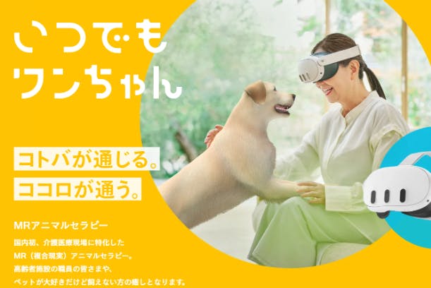 従来のVR(仮想現実)と異なり、MRゴーグルを装着した状態でも周囲の環境がしっかりと見えるため、高齢者の方々が安全に利用できることが大きな特徴です。転倒リスクを低減しながら、まるで本物の犬がそこにいるかのような温かい体験を提供しています。