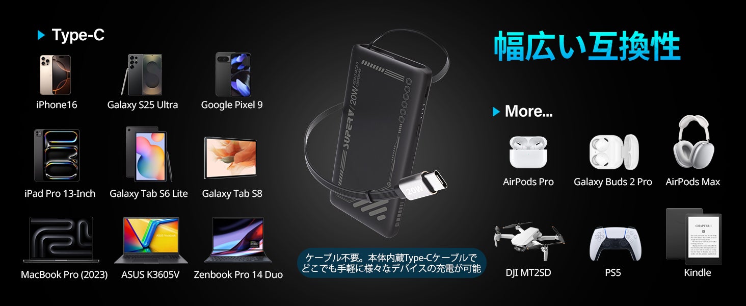 Power14のType-Cポートおよび内蔵Type-Cケーブルは、