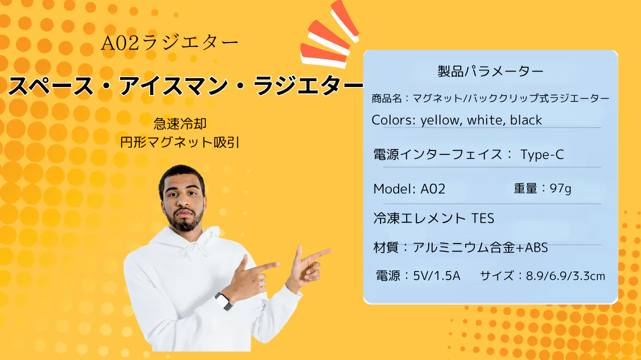 製品名: 磁気/バッククリップ 2 IN 1 ラジエーター色: 黄色電源インターフェース: Type-Cモデル: A02冷凍素子: TES材質: アルミニウム合金 + ABS重量: 97g電源: 5V/1.5Aサイズ: 8.9 x 6.9 x 3.3 cm