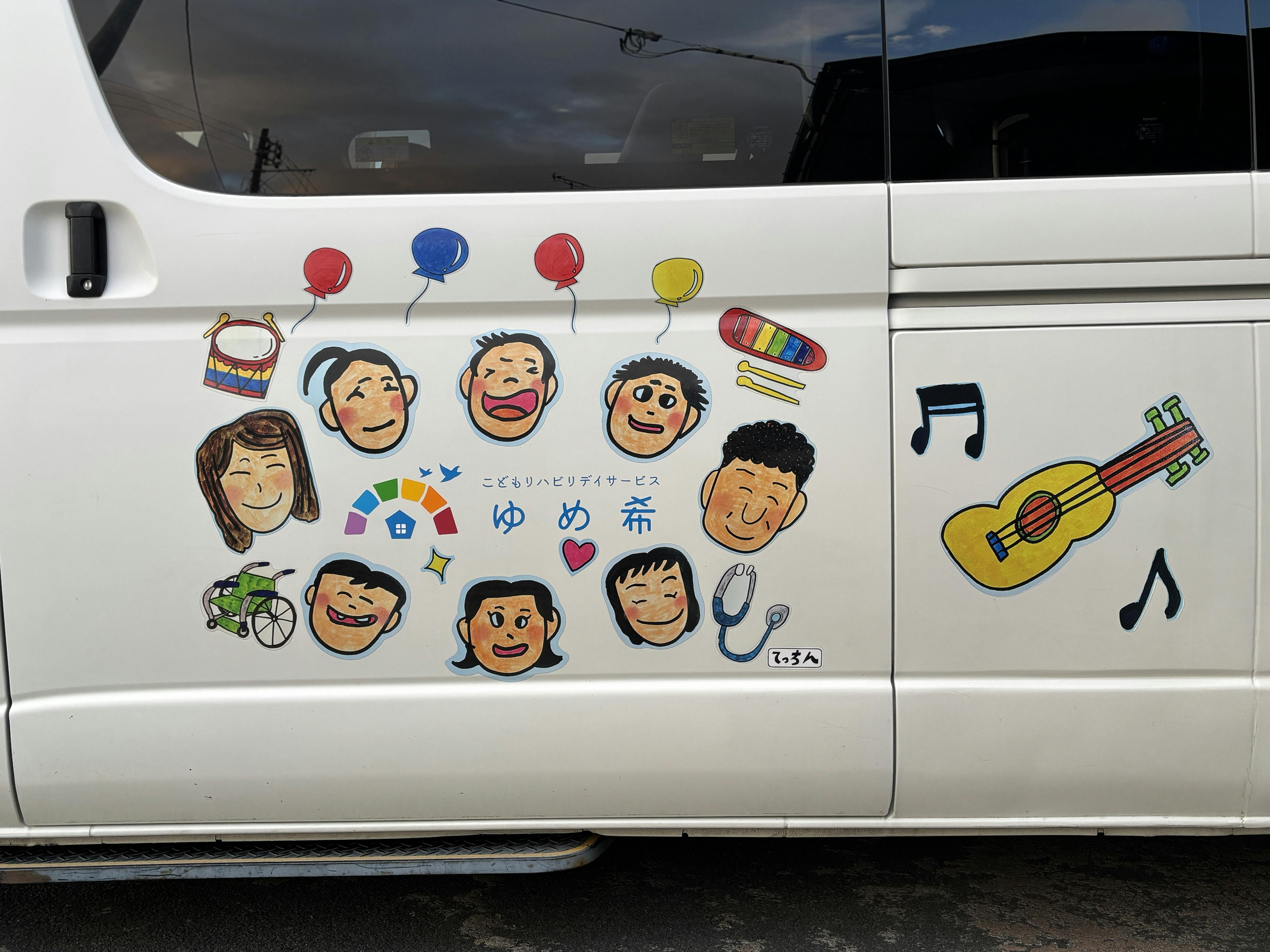 そんなてっちんが手がけたのが、「ゆめ希」の送迎車のデザイン。車体いっぱいに広がるてっちんの絵は、子どもたちやご家族はもちろん、地域の方々からも「かわいい!」「元気が出る」と大好評です。