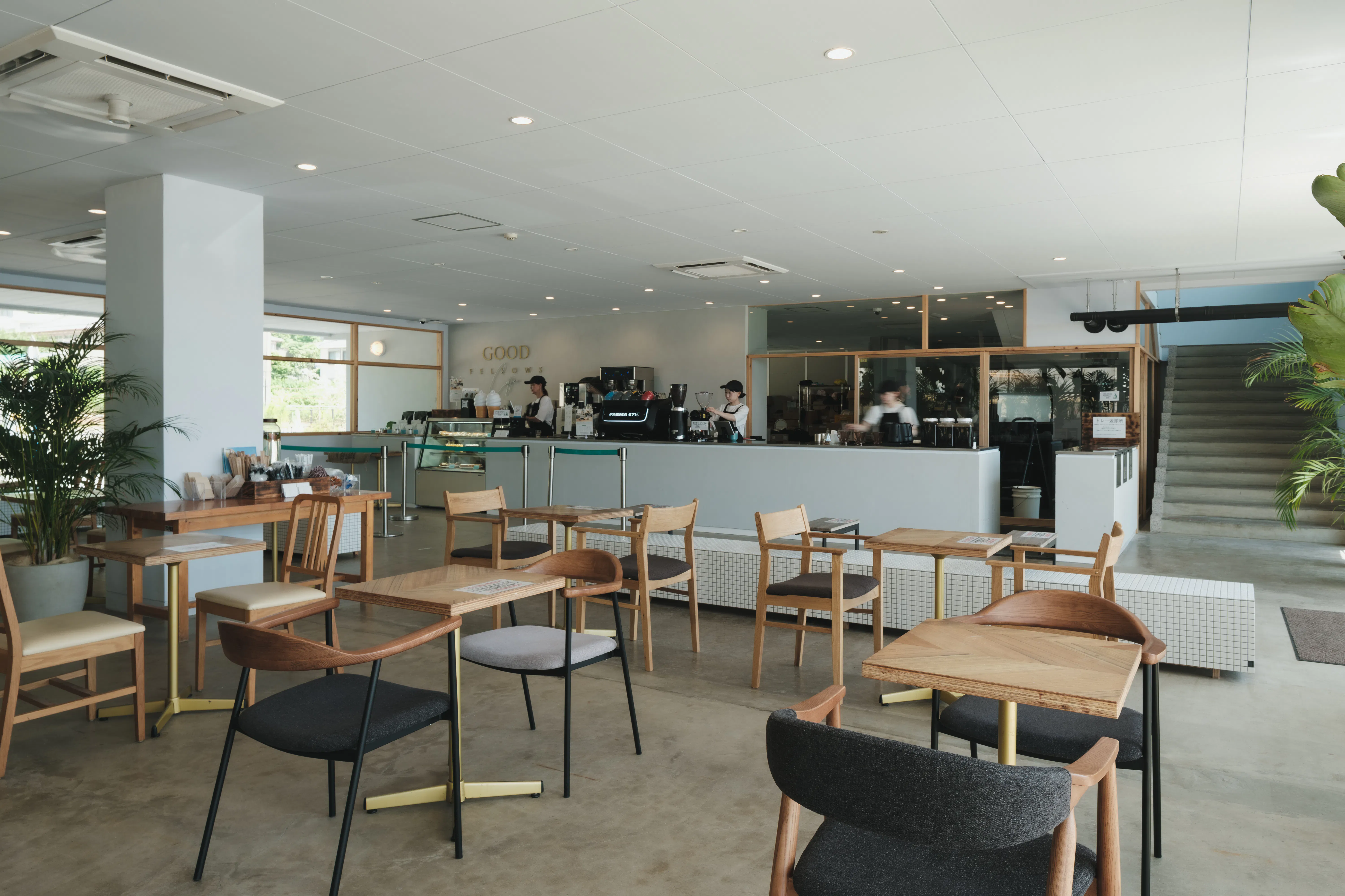 磯ビーチハウス1階:コーヒー焙煎カフェは連日大盛況!今年の3月にオープンした1階のコーヒー焙煎カフェは、磯の美しい景色を眺めながら、こだわりのスペシャルティコーヒーを楽しめる場所として、すでに多くの方々に愛されています。