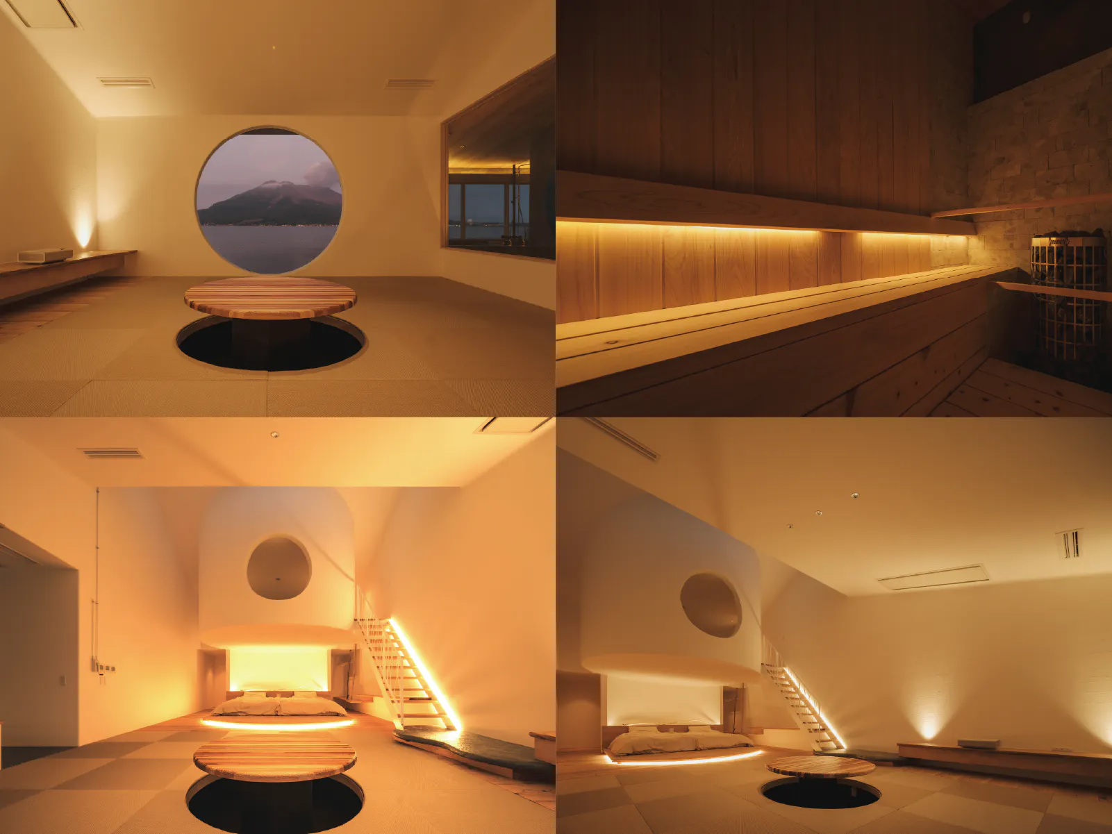 丸窓越しに映る桜島の景色は、まるで額縁に収めた一幅の絵のよう。サウナでととのい、丸窓の景色で心も丸く整う、そんな深い安らぎに寄り添うお部屋です。