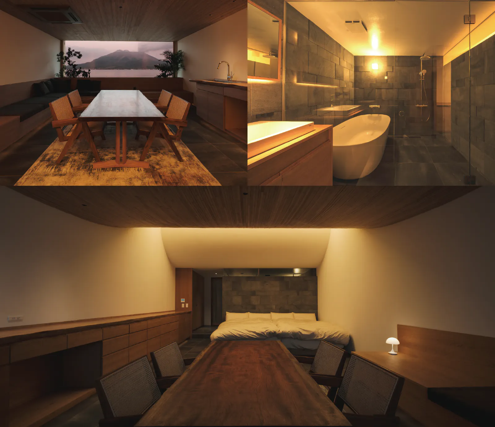 最大4名様までご宿泊可能な空間です。特に、ガラス張りの席からは桜島と錦江湾の息をのむような絶景を独り占めできます。ここで過ごす時間は、きっと久遠の思い出となるでしょう。