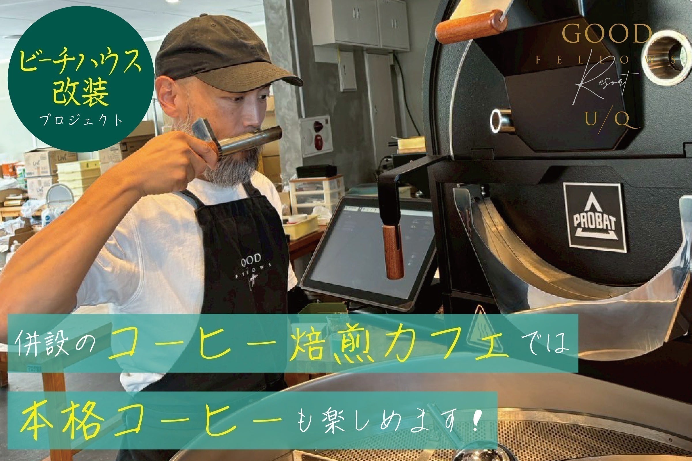 「ただ取り壊され、どこにでもあるマンションが建つだけでは、この場所の持つかけがえのない価値が失われてしまう」。そんな強い危機感を背に、私たちは立ち上がりました。この鹿児島の財産ともいえる絶景を借景に、見たこともないようなビーチ直結の焙煎所併設カフェ、そして2部屋限定の、これまでに体感したことのないオーシャンリゾートホテル「Good Fellows Resort U/Q」を開業させるに至ったのです。