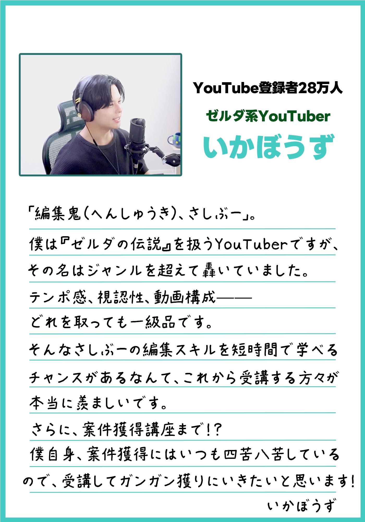 これは、スキルを活かしてお仕事を取ってきたり、より市場の上流に属して単価を上げたり、YouTubeチャンネルを拡大するなど、「動画編集でお金を稼ぐ」ノウハウを学ぶものです。