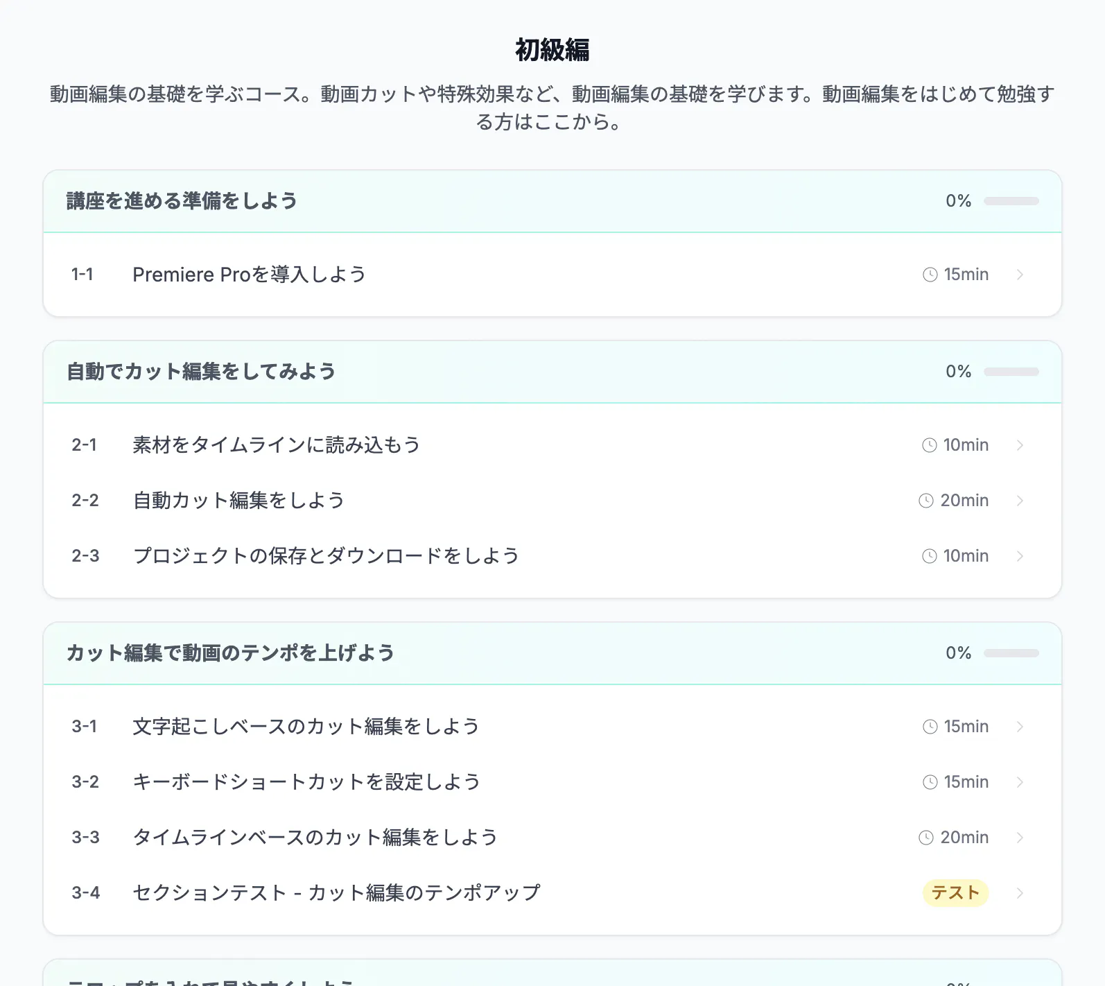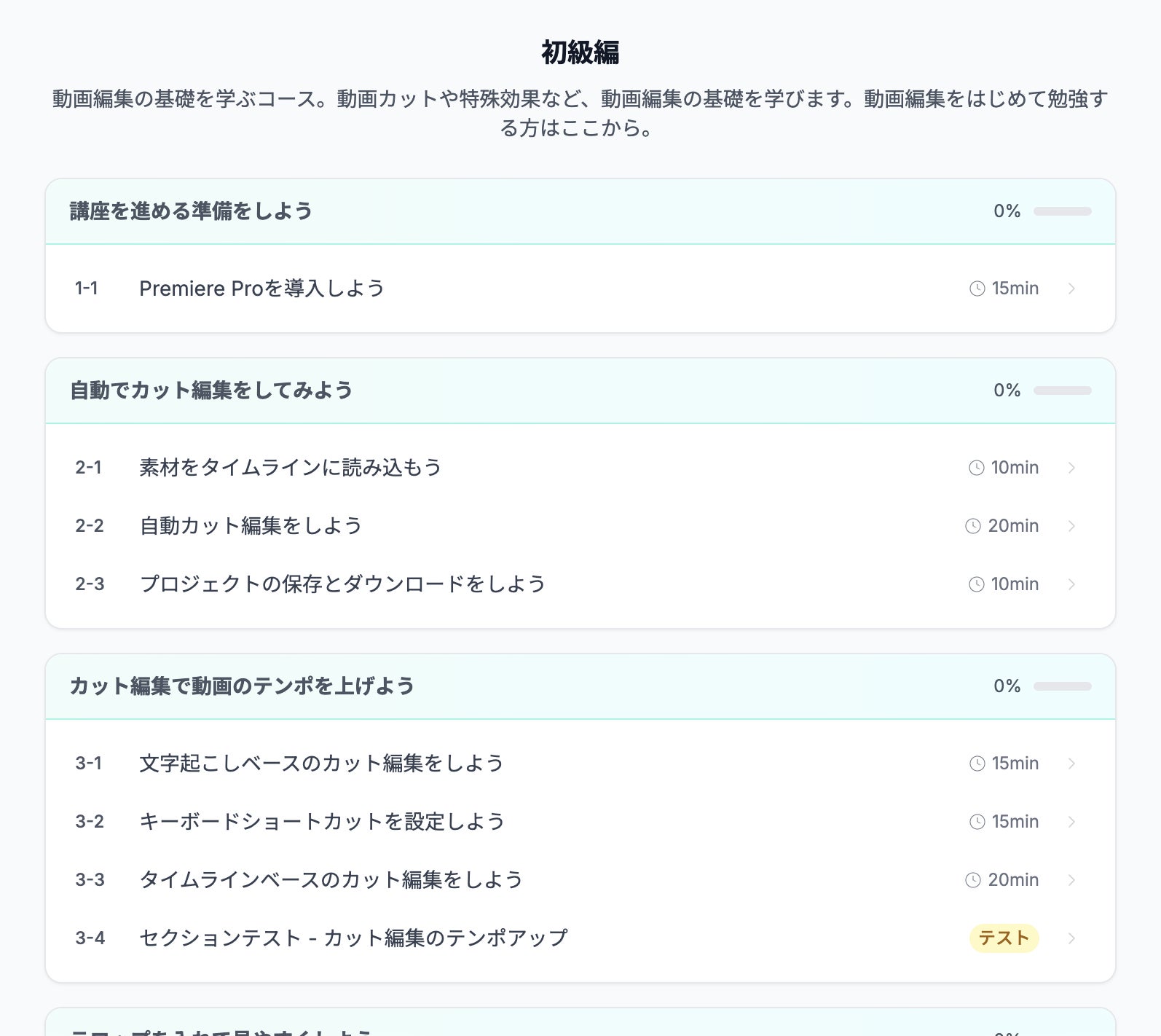 そのため動画編集スクールにありがちな「セミナー」という形式ではなく、オンラインで一人で完結するサービスです。