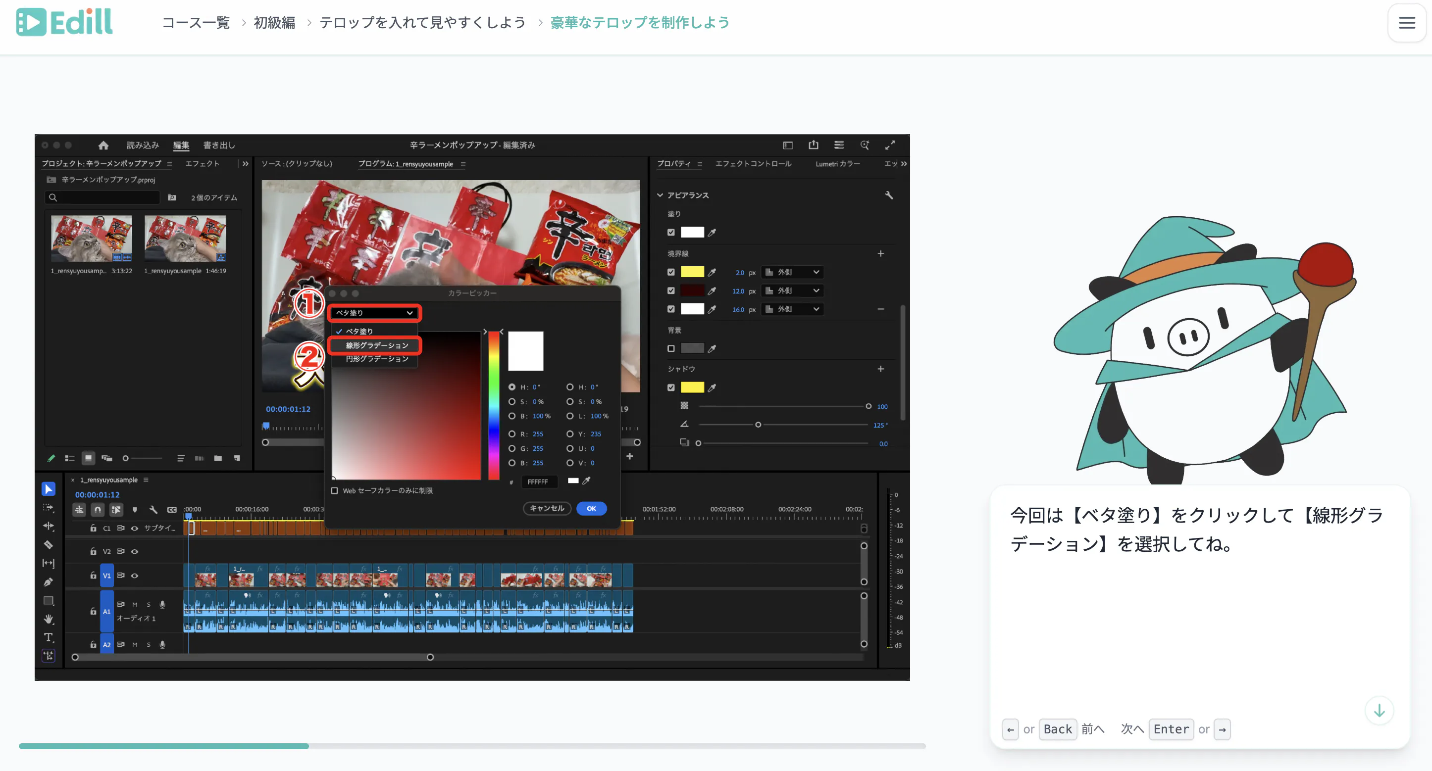 エディルのカリキュラムは初級・中級・上級の3段階で構成されています。 初級コースだけでも自動カット編集やテロップ入れ、豪華なテロップの作り方、アニメーション、BGM挿入など動画制作の基本を一通り習得できます。