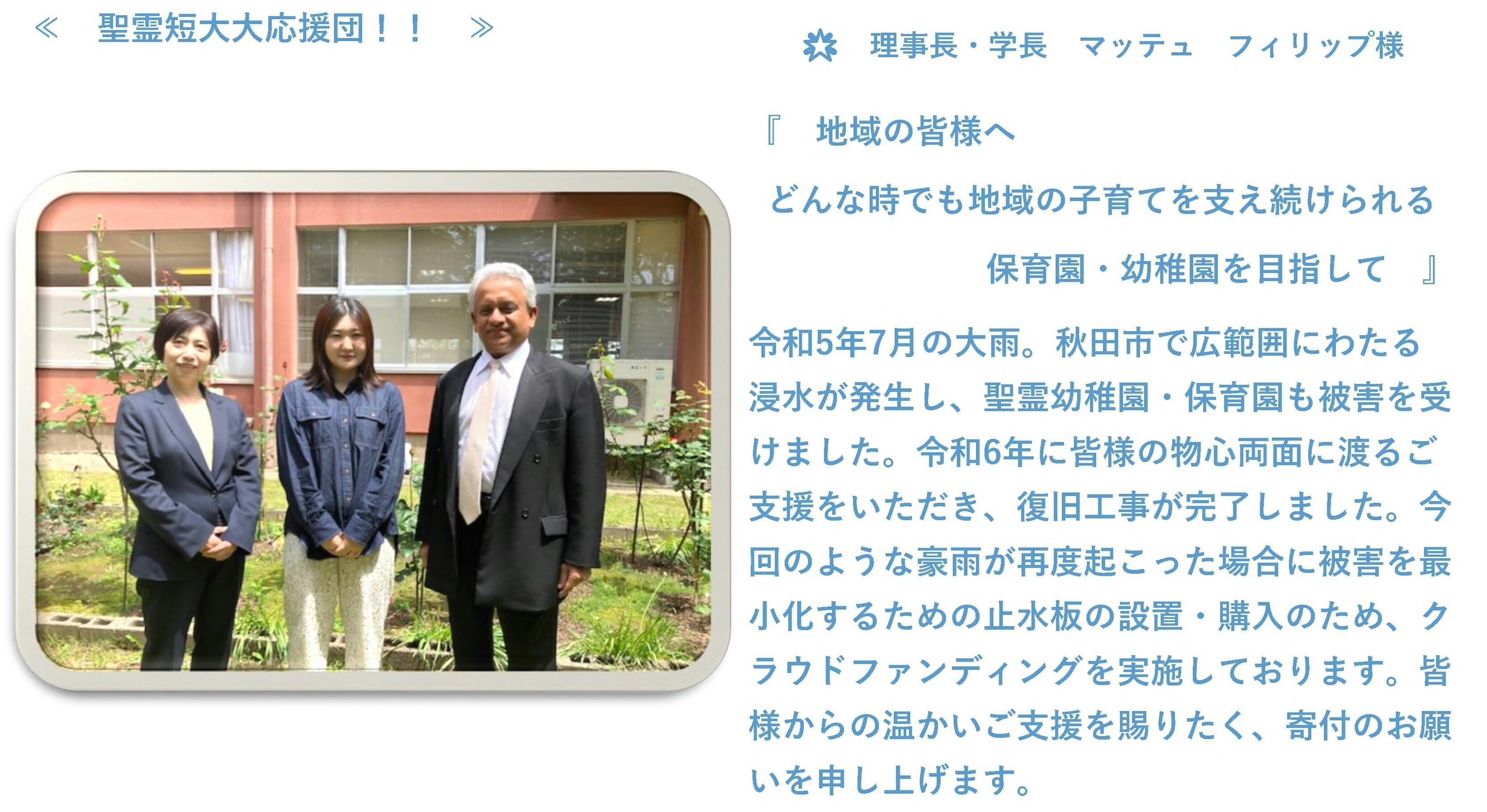 2025/09/30 17:46今日も子どもたちにとっては “9月30日” を終えようとしています。いつもと変わらない1日。でも昨日とも違う、同じ1日ではない1日。泣いても、笑っても、怒っても…同じなことは無いのです。それは子どものみならず、大人にとっても同じ事。私たちはその毎日を繋ぎ、子どもの成長を願い、また明日と言える事の大切さを胸に今日も過ごしております。園庭のお砂場では子どもたちが全身に砂をかぶりながらも友達と笑いあい涼しい風の中、シャボン玉を追いかけ『きょうは ともだちと こんなことしてあそんだよ!』『ねぇねぇあのね、おもしろいことがあったの!』『…あのね…じつはね、ともだちと けんかしちゃった…』『ねぇねぇ きいて…』きっとお家でもいっぱいお話をすることでしょう。そして『また あしたね…』こどもたちはお家に帰っていきます…この日常を守るべく、お支え下さいました皆様へ『止水板設置プロジェクト』を最後までお支え下さいました皆様、本当にありがとうございました。聖霊幼稚園・保育園が目標としておりました設定を超えるご支援をいただけました事、職員一同感謝申し上げます。2年前のあの日のこと、それは紛れもない現実として私たちの目の前に存在しました。あの時の戸惑い・恐れ・迷い・不安…様々な感情の中を過ごしておりました。しかし、その中であっても、子どもたちのまっすぐな目の輝きや笑顔、元気な声を聴くたびに、奮い立たされ背中を押されてきたのだと、今ならそう確信を持って言い切れます。今回のプロジェクトにおいても、奇しくもあの日と同じ日に開始日を迎える事となり、そこには、あの日のワダカマリの山が心の中にあり、そこを乗り越えて前へ進むべきだと言われているような気がしてならないような思いがありました。以前、聖霊に縁のある方からこんな言葉をかけられました。『前を向かなきゃ!前に進まなきゃ!昨日はもう過ぎてしまったんだよ!』はっ!としました。前を向き歩いてきた毎日と今回のプロジェクト。大雨の浸水被害の事に対して、私たちの最後の『ラスト ミッション』だと…そして、ここから新たに私たちのスタート、一歩が始まります。止水板においては、大雨が起きた時、園を守る要となることでしょう。願いとしてはそれを使用することが無く過ごせることが一番なのですが…皆様のこのご支援を大切に次の子どもへ繋いでいきたいと思います。本当に 本当に ありがとうございました。聖霊女子短期大学付属幼稚園・保育園職員一同最後に聖霊幼稚園・保育園の大事な玄関を守っているお友だちを紹介させていただきます。あの日あの時、浸水が始まった時も、絵本棚が倒れた時も、子どもたちの世界が泥水の渦に巻き込まれていく時も、浸水が引いていく時も、園が解体され再生を迎える時も、子どもたちの笑顔も、私たちの汗も涙も全てを見守ってくれていたお友だちです。マリア様の一番近くにいて、全てを見守っていてくれてありがとう。そしてこれからもお守りください。全ての人々に笑顔と平和が訪れますようにたくさんの人が悲しい思いをしている時苦しい時を迎えている時いつでもそばにいて見守っていてくださいますように子どもたちが光の子として世界を照らしたくさんの人と手を繋ぎ支え合う事ができますようにみなさんに最光の最幸が訪れますように!! もっと見る