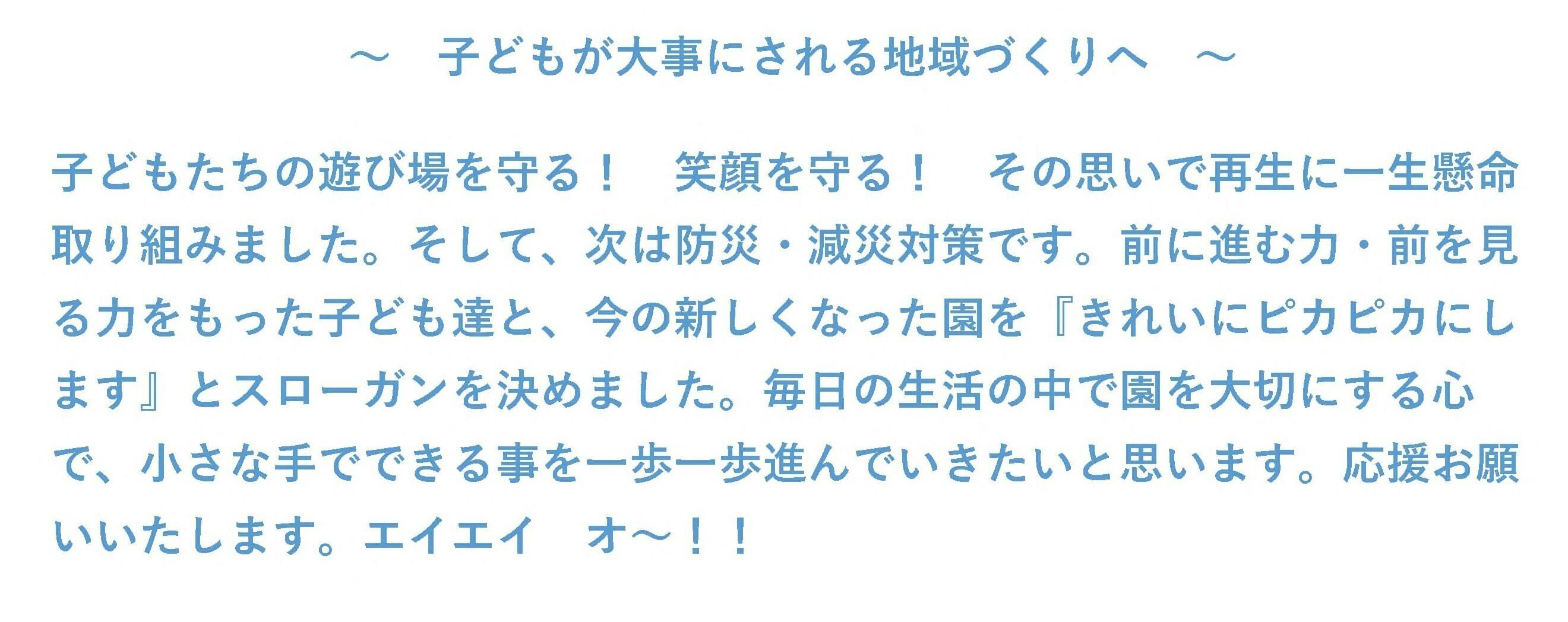 止水板の設置に向け、園に関わる様々な方のご協力を得て、園舎入口(鉄扉)・園庭・園内設備入口(裏口)など様々な場所に工事を行っております。再び同じ被害を繰り返さないよう、防災設備の設置に一歩を踏み出し、園での子ども達の生活のみならず、地域とのつながりを密にしながら子ども達が安心して未来を築く事ができるように、笑顔を守ることができるよう、「光の子として」の未来への一歩を守っていきたいと思っております。何卒ご支援をお願いいたします。
