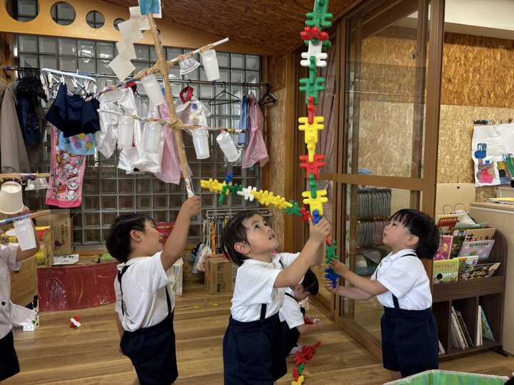 夕方になると、どこからともなく聞こえてくる竿燈囃子…暑い毎日の中、秋田市内もお祭りのワクワク感が漂ってきました。それに合わせて、園内でもお囃子の音に合わせて小さな竿燈の差し手たちが技の披露!!さすが大きい組のお兄さんたち!!肩や腰、手のひらの角度が熟練されています。それを見た小さい組さんたちもブロックを組み立てて、さぁ挑戦!