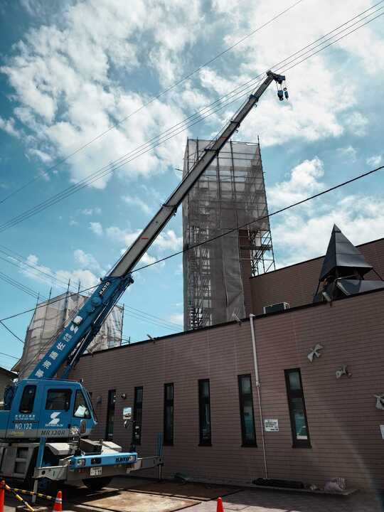 夏の天色の空にゆったりとした雲が泳いでいる中、聖霊幼稚園・保育園の塔が姿を変えようとしております…時間が流れていく中に様々に変わっていく姿、日々の変化はあろうとも心はこのように晴れ渡った青空でいたいものですね。