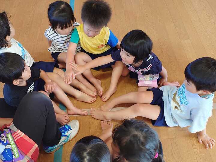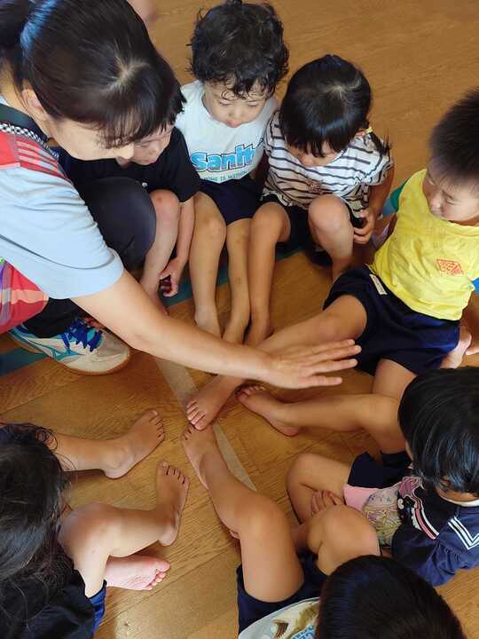 毎日の暑さの中、外では思いっきりかけっこも難しい!今日は涼しいホールで、はだしになって、いっぱい身体を動かすぞ!!