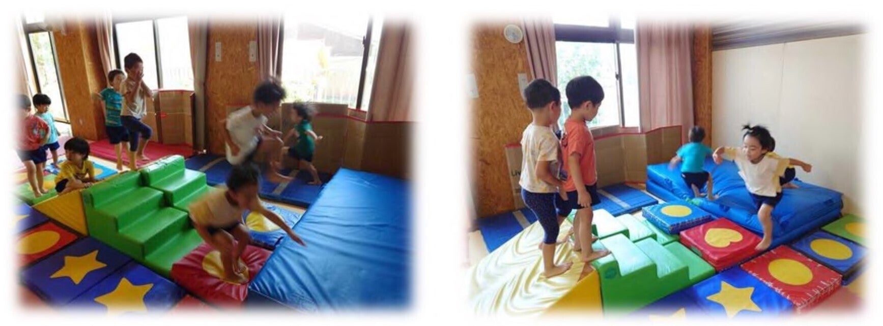 大きなマットまで…『とどいた~!』『あとちょっとだった~!』『おもしろ~い!もう1回やる~!』全身をバネのようにしならせて飛んでみたら楽しいね!だんだんコツもつかんで、レッツ・チャレンジ!!