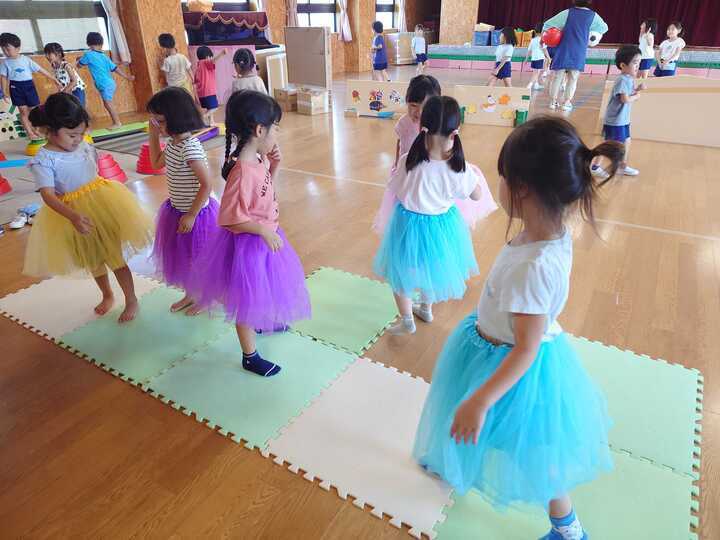 本日は猛暑!窓を開けても、みんなの大好きな園庭に抜けるテラスの扉を開けても、熱風しか入らない!本当はお日様をいっぱい浴びて、めいっぱい身体を伸ばして遊びたいけれども、今日はみんな一緒、ホールで遊ぶぞ!
