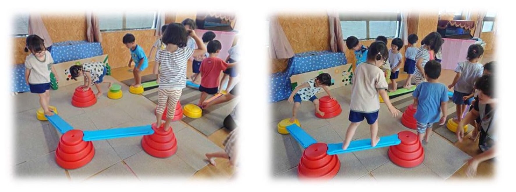 『つぎのところまで、あとちょっと…』『どっちのあしだしたらいいの~!?』『いっぽんばし…わたしドキドキ!せんせい、そこで見ていてね☆』