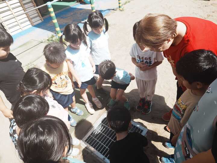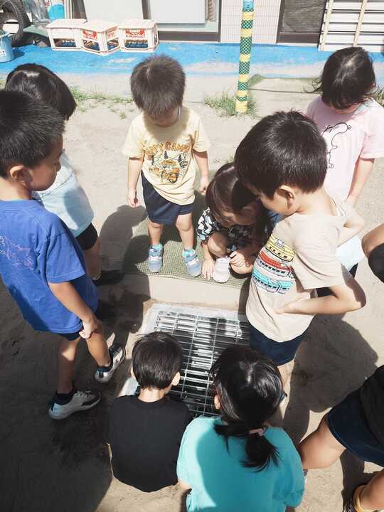 『園庭に溜まった雨水が、幼稚園の中に入らないようにするためにポンプを使って外に出すんだよ』『このポンプを付けてくれたお兄さんや、工事をするために支えてくれたたくさんの人にありがとうだね』『今度はこの事をたくさんのお友だちに伝えてね』とお話をいただくと、真剣なまなざしの中、何かしら心の中にいろいろと芽吹いてきたようです。