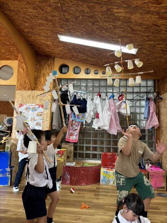 夕方になると、どこからともなく聞こえてくる竿燈囃子…暑い毎日の中、秋田市内もお祭りのワクワク感が漂ってきました。それに合わせて、園内でもお囃子の音に合わせて小さな竿燈の差し手たちが技の披露!!さすが大きい組のお兄さんたち!!肩や腰、手のひらの角度が熟練されています。それを見た小さい組さんたちもブロックを組み立てて、さぁ挑戦!『どっこいしょ~♪どっこいしょ~♪』秋田の夏も、もうすぐそこまで来ています。 2025.07.17