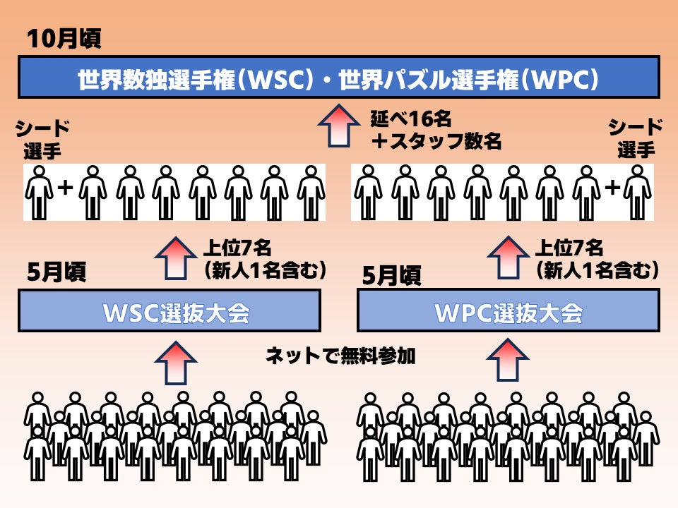 JPFは、毎年、世界数独選手権・世界パズル選手権の日本予選を開催しています。各部門につき8名(シード・新人枠含む)が日本代表の権利を得て、秋に開催される両大会に参加します。