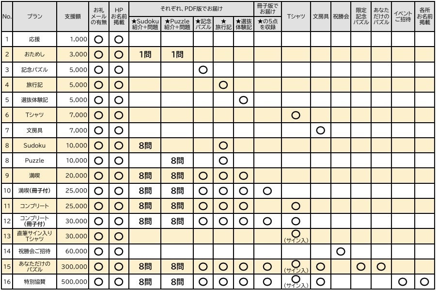 2026/03/31 12:00以下の返礼品が完成し、ご支援いただいたプランに応じたデータ、ならびに冊子を発送いたしました。・日本代表1名によるWSC2025の問題紹介(1問)+練習問題(1~2問)・日本代表1名によるWPC2025の問題紹介(1問)+練習問題(1~2問)・WSC・WPC2025記念パズル(5問)・WSC・WPC2025旅行記(選手紹介・WSC紹介・WPC紹介・現地の写真集)・WSC・WPC2025選抜体験記・WSC日本代表選手8名によるWSC2025の問題紹介(8問)+練習問題(各問題につき1~2問)・WPC日本代表選手8名によるWPC2025の問題紹介(8問)+練習問題(各問題につき1~2問)裏表紙にも現地の様子がたっぷり詰まっていますお届けがたいへん遅くなってしまいましたが、日本代表選手団のパズル愛の詰まった冊子となっております。ぜひご堪能ください。本プロジェクトにつきましては、「あなただけのパズル」プランの実施を残すところとなりました。こちらにつきましても、当初実施予定の2026年3月よりも遅れておりますが、現在問題作成を終え、印刷・送付用のデータ作成を進めている状況です。いましばらくお待ちいただければと思います。 もっと見る【お詫び】返礼品発送時期が遅れます