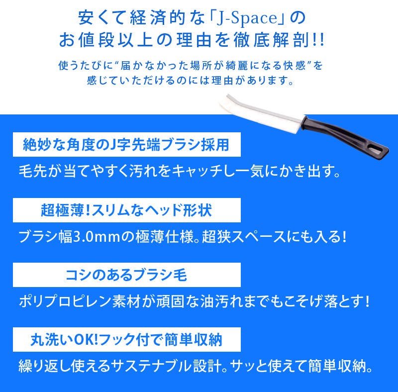 歯ブラシなどの毛先ではナイロンやポリエステル樹脂が使用されておりますが、J-spaceはポリプロピレンを使用している事からヘタレにくい特徴を持ち合わせております。
