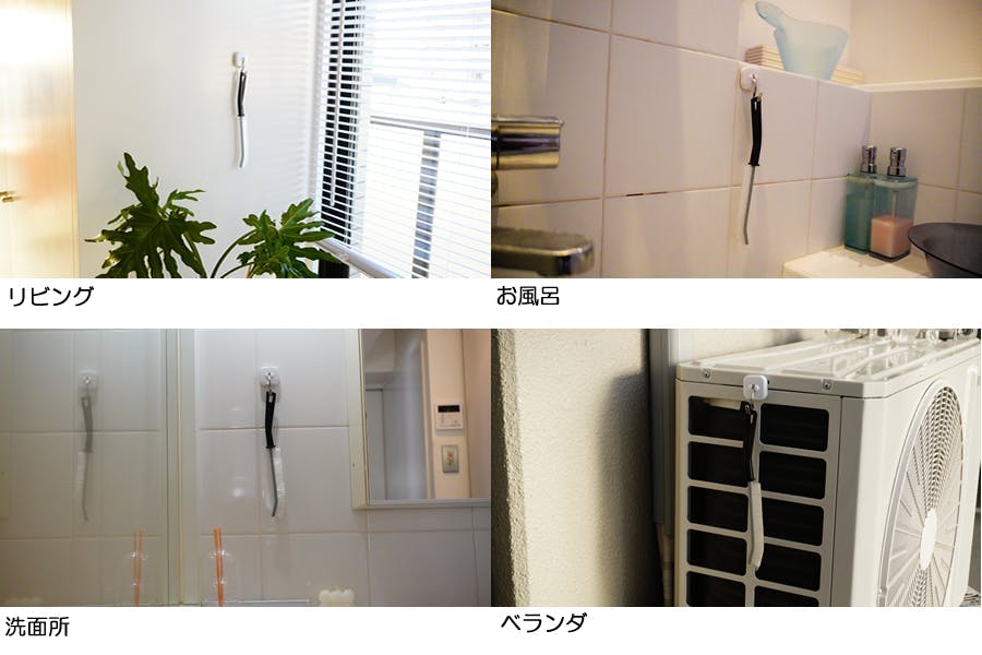 J-spaceはブラシ部分を上に向けても倒れない設計になっており、隙間や端っこ部分などに縦掛けて収納することが出来ます。