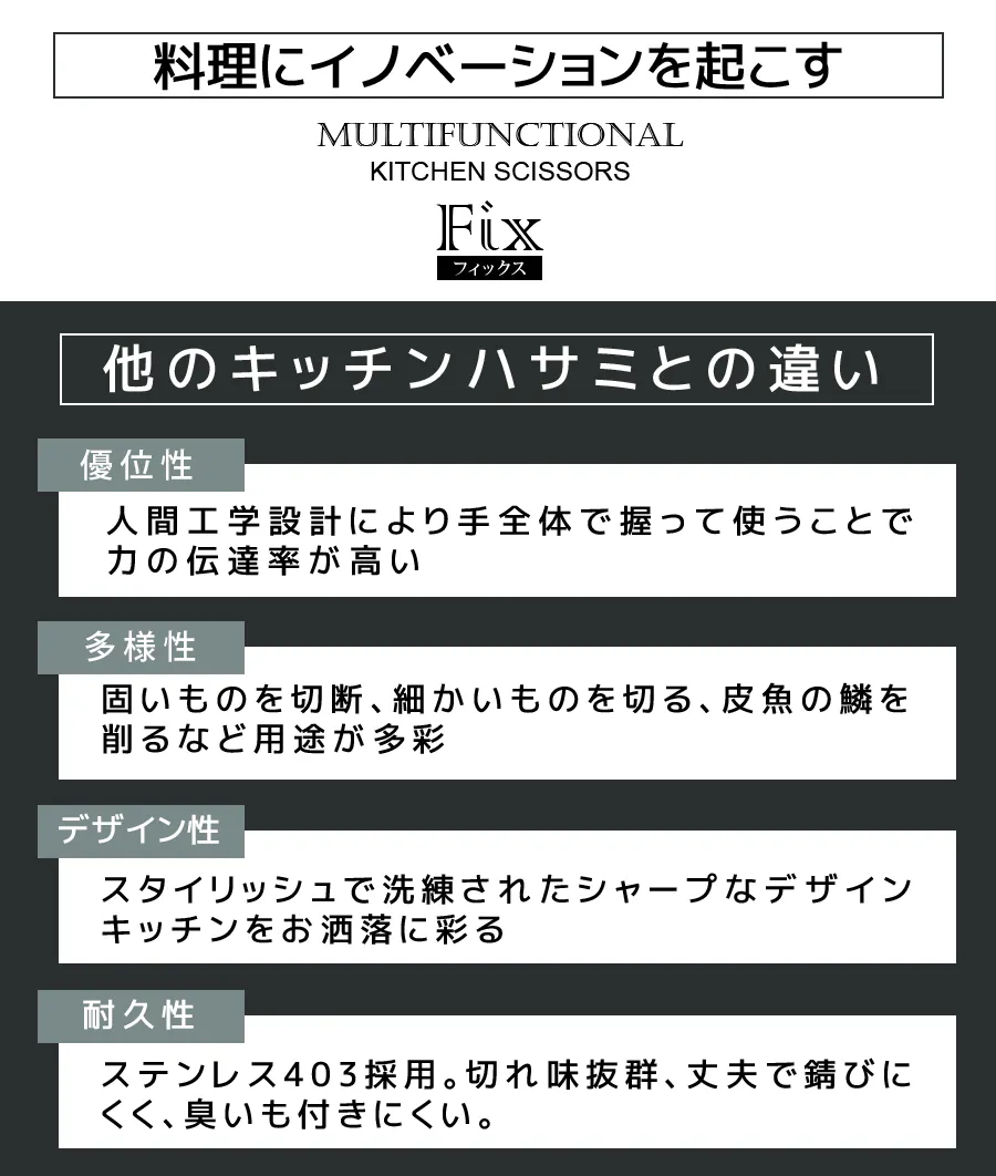 包丁、骨斬り包丁、鱗とり器など各それぞれが世の中に出回っている中「Fix-フィックス-」1台でこの3役を賄える上に、ハサミとして上記機能を備えている事からお子様のお料理練習や高齢者様、手に障害をお持ちの方でも安全にお使い頂け、幅広いお料理に挑戦する事が可能になります。