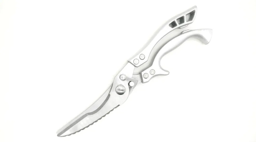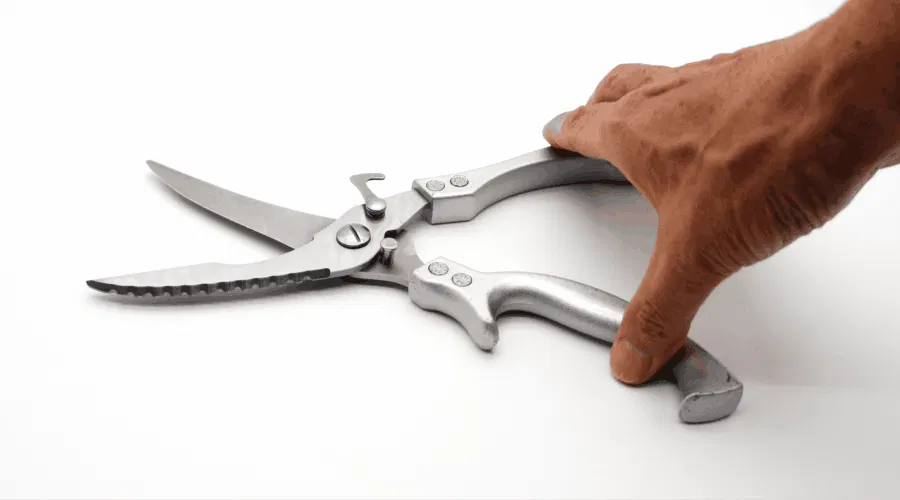 チカラが弱い女性の場合は、刃の奥の付け根部分に肉を骨ごと挟んで「(※注意)下のグリップ部を床に付けて上から体重をかけて押し切る」と骨まで切断することができるはずです。皮の部分は、ハサミの先端を利用して切ってください。