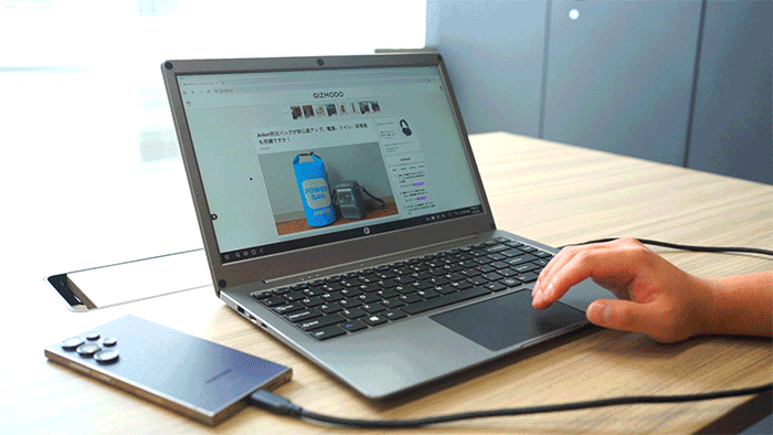 「CrowView note」が輝く使い方のひとつがPCモード搭載Android*との組み合わせ。普通のモバイルモニターで使う場合に比べ、キーボードやマウスの用意が不要というのが便利なポイント。