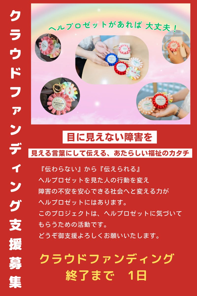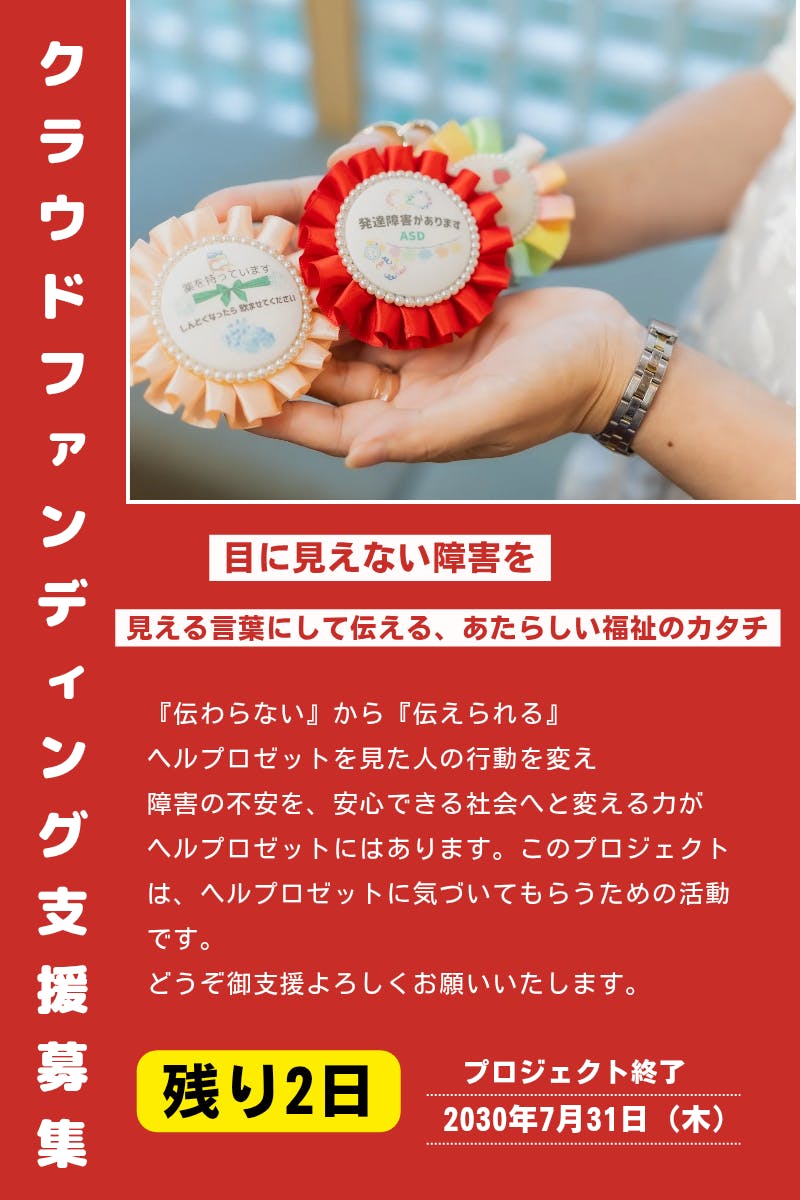 2025/07/27 21:43プロジェクトをご覧いただきありがとうございます。クラウドファンディング終了まで残り4日。これまでの御支援、応援メッセージありがとうございます。皆さまからの気持ちを胸において最後までをヘルプロゼットへの想いを伝えさせてください。イベント出店時、私がお客さまにヘルプロぜットを作ろうと決めた想いを伝えると「たしかに」「大事よね」「これいいよね!」「写真撮っていいですか?」と言っていただきます。ヘルプロゼットに気づいてくださって、知ってもらう。理解してもらえることは、とても嬉しく、より多くの人にヘルプロゼットの存在を届けたいと心から思います。しんどい気持ちは、相手に伝えないと理解してもらえないよ。という表現が日常生活にあると思います。“相手に伝える”ヘルプロゼットはこの役割を持っています。目に見えない障害を見える言葉にして伝える、新しい福祉のカタチ。みなさんが抱えている「実は私、、」の気持ちをヘルプロゼットに変えて、自然にそっと寄り添います。障害福祉、医療関係のイベントを始め、学園祭など、障害の有無に関係なく多くの人にヘルプロゼットを知ってもらう。クラウドファンディングの御支援をいただき、伝える活動を続けていきたいと考えています。どうぞ御支援、拡散、応援よろしくお願いいたします もっと見る