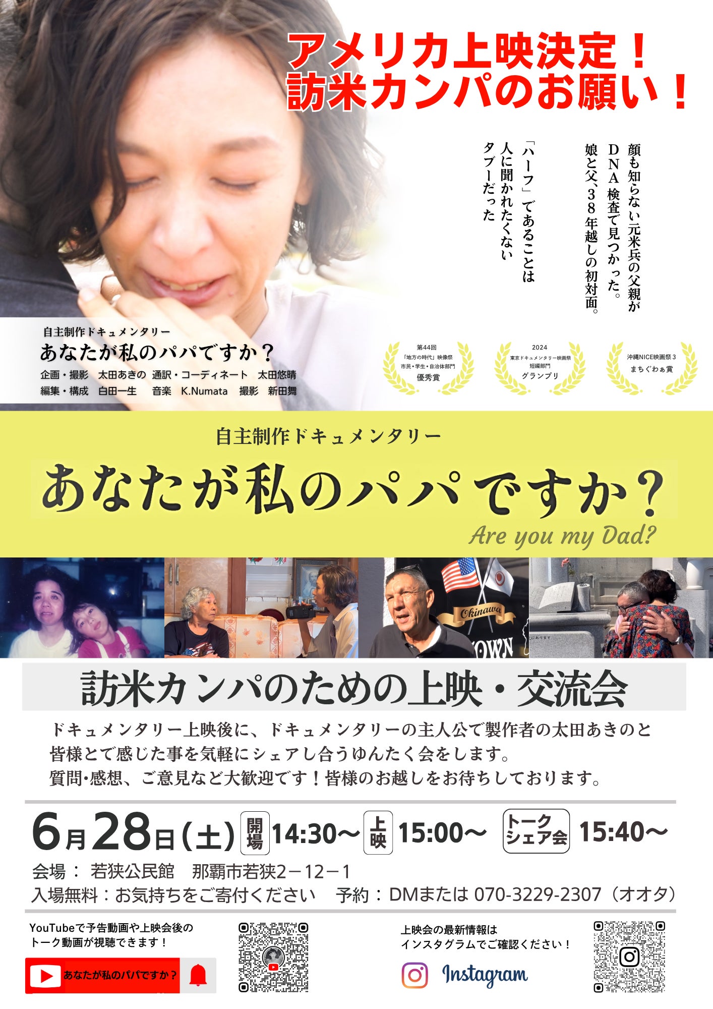 7月27日にアメリカのネバタ大学で元米軍人とその家族による国際的な平和団体 「平和を求める元軍人の 会(VFP)」の年次総会に参加しドキュメンタリー「あなたが私のパパですか?」を上映しました。コロナ禍を経ての数年ぶりの開催ということもあり、プログラムの進行が大変押してしまい「あなたが私のパパですか?」を上映する時間がなくなってしまうというアクシデントが起きてしまいました。とても落ち込みましたがVFPの会長さんらに相談した結果、翌日上映する時間を作っていただきました。その際に翌日に登壇される方々からお時間を少しずつ分けていただきました。ご協力いただきありがとうございました!そのおかげでドキュメンタリーの上映は「宜野湾ちゅら水会」の登壇後となり結果的にとてもベストなタイミングになりました。有害性が指摘されている有機フッ素化合物(PFAS) 問題に取り組む市民団体「宜野湾ちゅら水会」のメンバーの、まつだかなこさん、宜野湾市議のプリティ宮城ちえさんが先住民族の女性権利の観点から琉球•沖縄の歴史や米軍基地による被害の現状、PFAS汚染問題へ連帯の呼びかけを行いました。参加者が沖縄に関心を持った直後のドキュメンタリー上映ということもあり拍手喝采のハグいっぱいの大成功になりました。感激で涙が溢れました。またVFP の琉球・沖縄国際支部であるVFP-ROCKは名護市辺野古の新基地建設反対と、浦添西海岸への那覇軍港移設反対の決議案を夫のキノコビーツとハワイから駆けつけてくれたピート・ドクトルさんが提出し、満場一致で可決されました。VFPは可決された決議案をアメリカ政府に働きかけるようです。ご支援いただいた皆様、応援してくれた皆様、VFPの皆様本当にありがとうございました!
