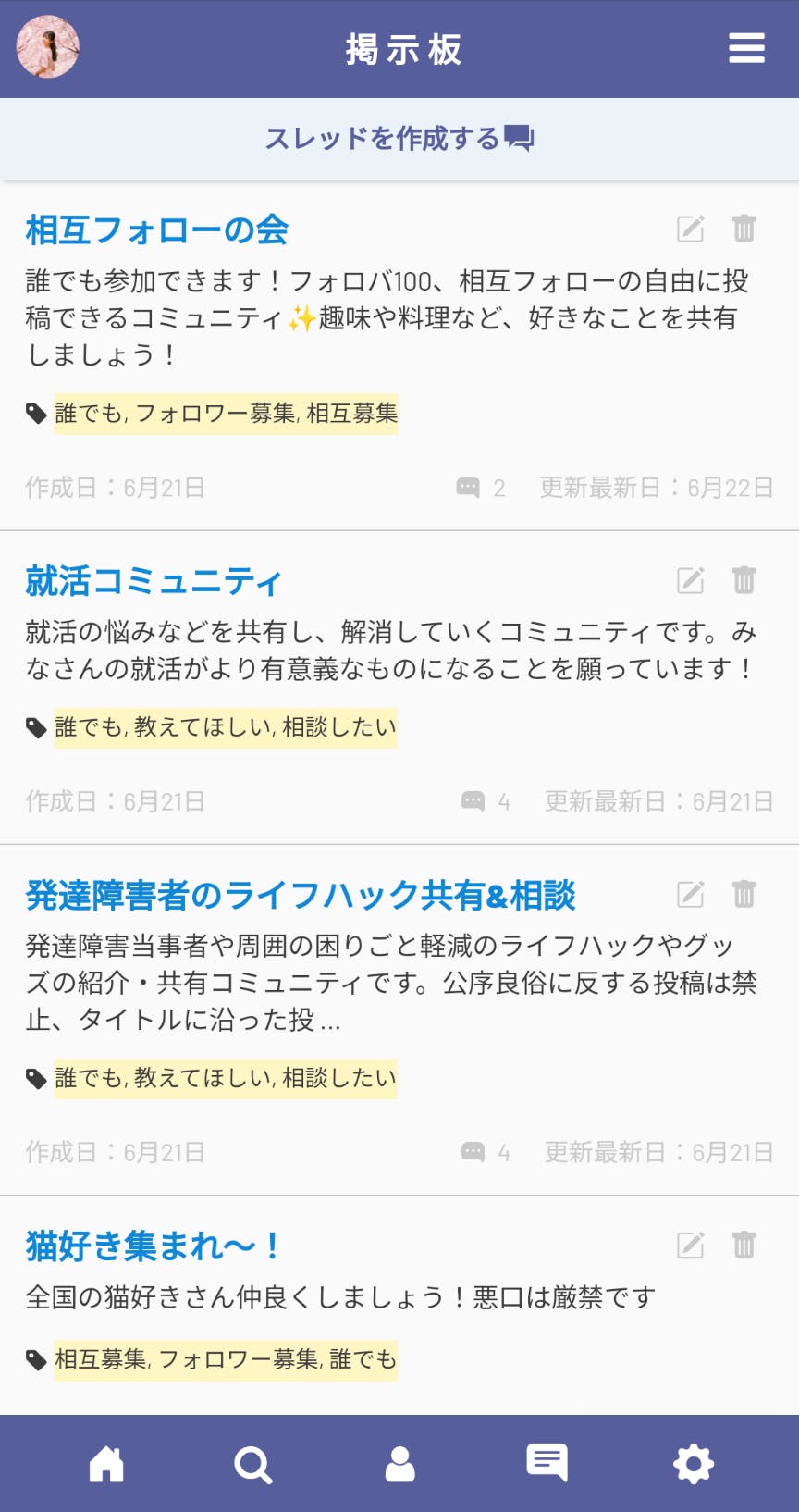 こんにちは、マッチングや交流を深める場として「掲示板」を開発中です!・誰でもスレッドを作成できる(タグ機能でカテゴリー分け)・スレッドに対してのコメントやそれに対するリプライ機能を現在実装済みです!引き続き開発を進めてまいります!