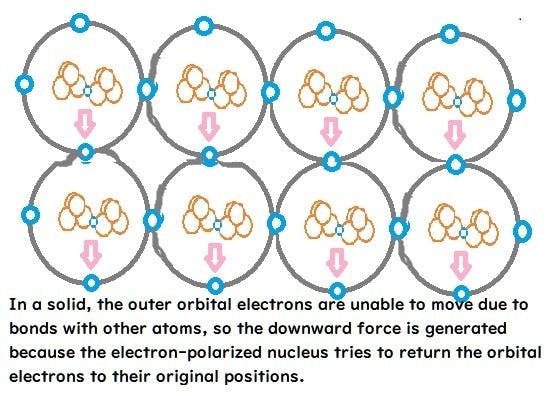 シューマン共振で電子分極が起きた原子は原子核が少しだけ下にずれます。すると固体では原子の外側の電子がほかの原子と結合しているため動きにくくなっています。原子核が元に戻ろうとする力が下向きに発生します。原子核は軌道電子よりはるかに重いため、軌道電子を押し下げようとする力が現れます。1つ1つの原子でこの力が発生し、ベクトルの合成されたものが重力です。