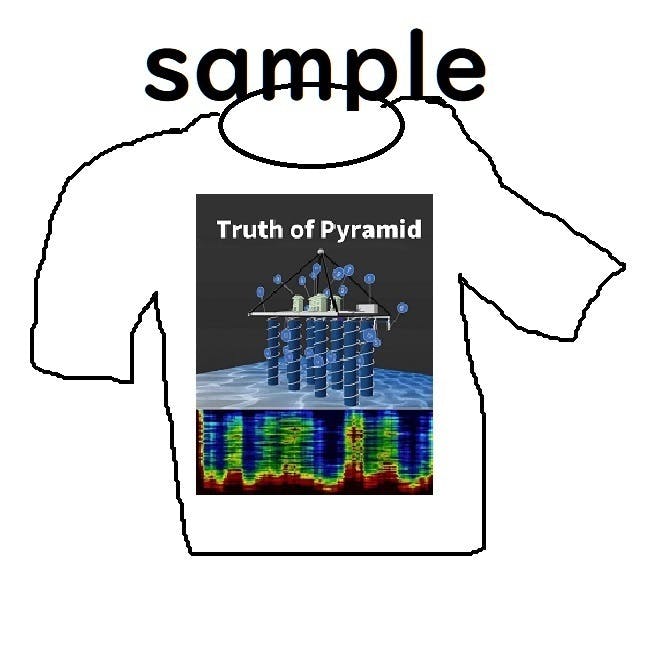 リターンはピラミッドの地下に発見された巨大構造物をプリントしたTシャツです。SAR衛星という最新技術を駆使して判明したピラミッド下の600メートルにも及ぶ8本の柱を描いています。古代文明の科学技術を象徴するイメージです。反重力技術に期待してくれる方々が満足できるデザインだと思います。