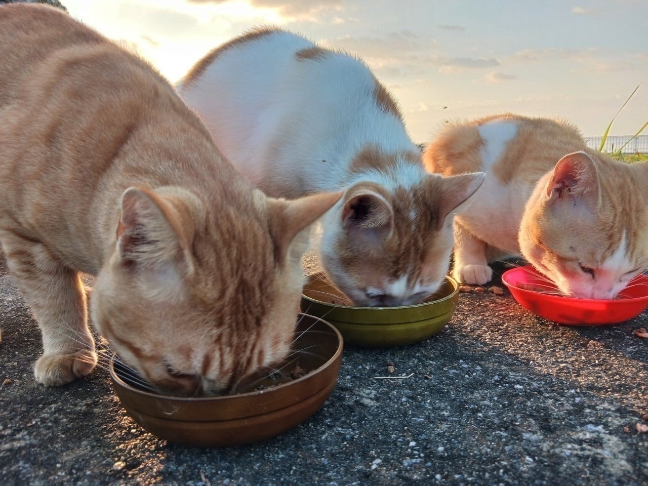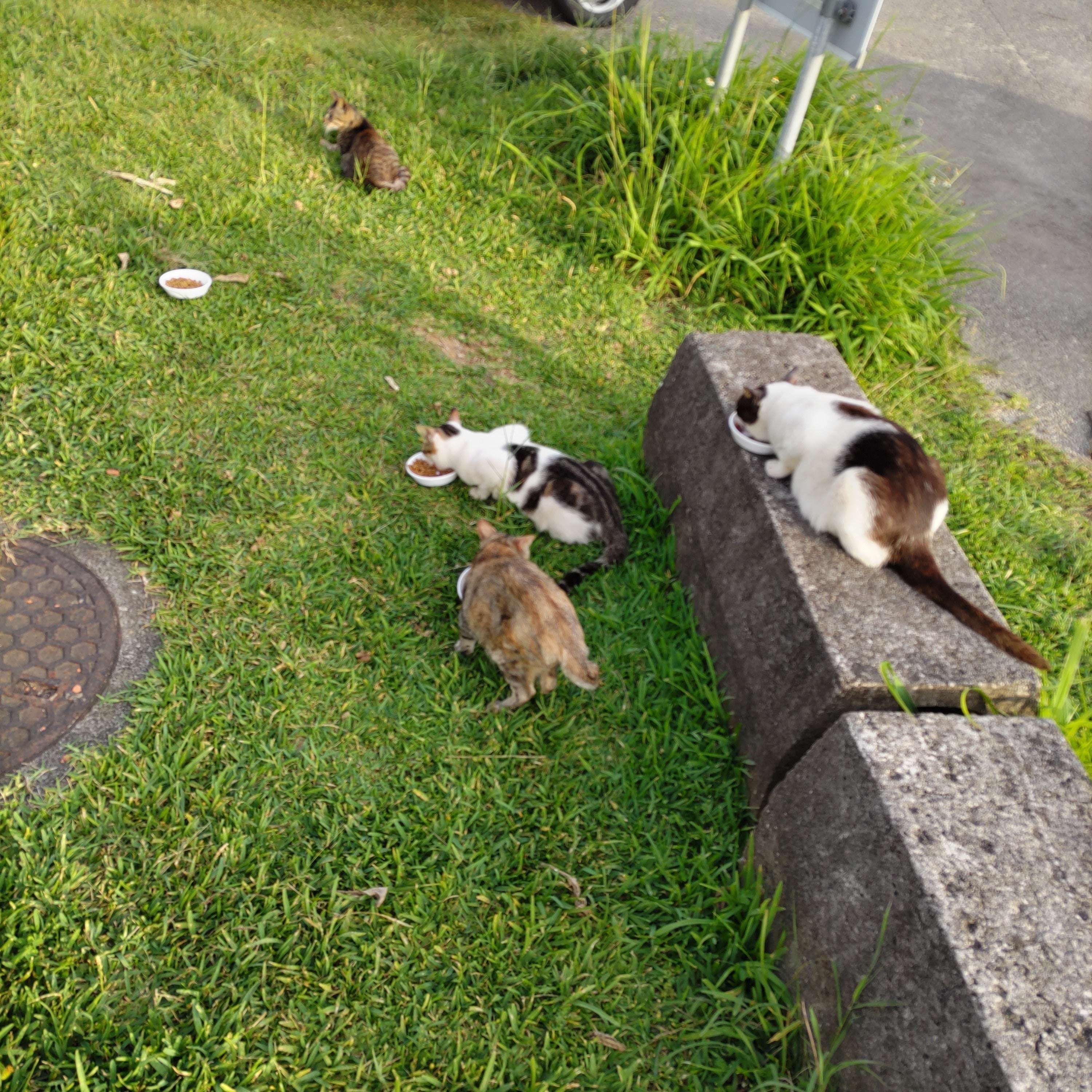 ラリマーは石垣市の許可のもと、南ぬ浜町緑地公園の猫たちの餌やりと傷病治療をしています。