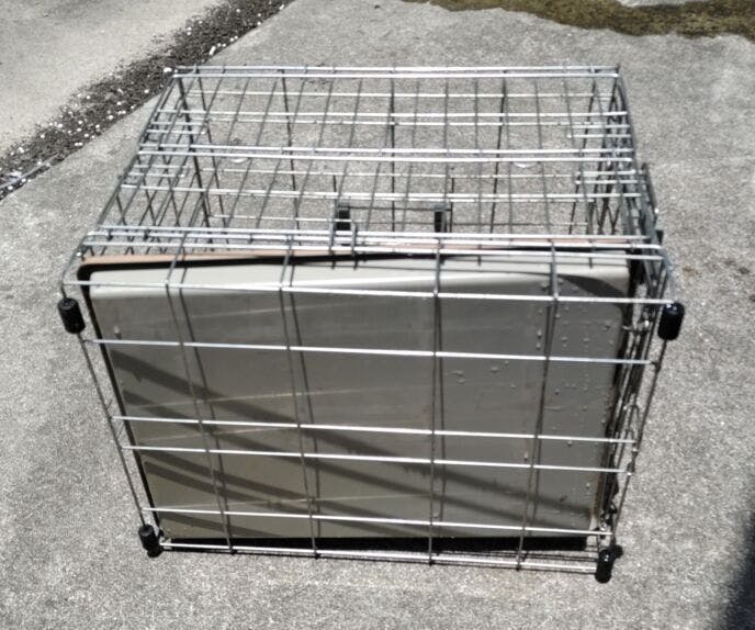 さっき保護部屋代わりのガレージに行ったところ、なんとケージを横転させて、底部の隙間から抜け出していました。