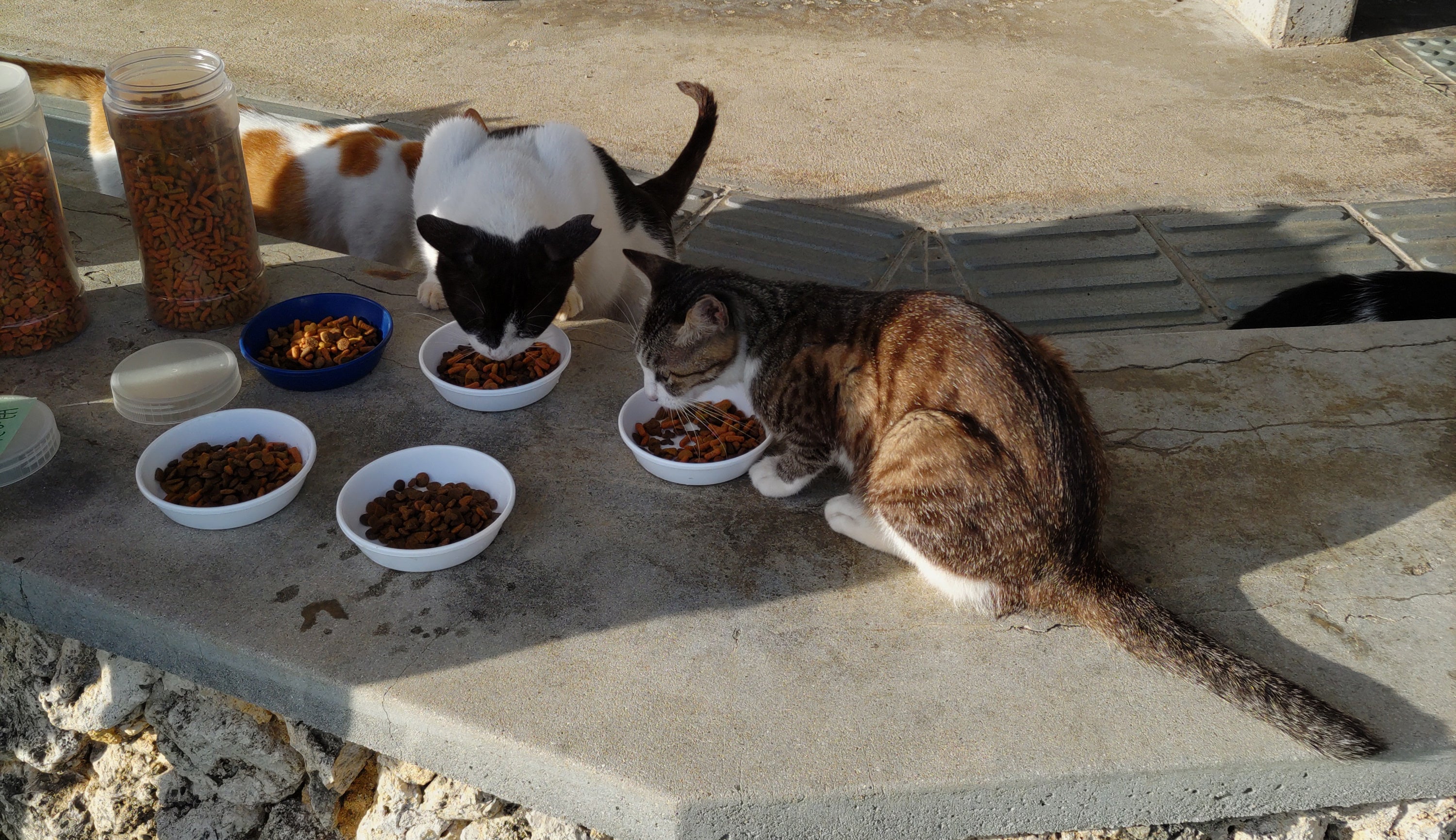 南ぬ浜町緑地公園には、石垣市の公認で餌やりをしているボランティアたちがいます。