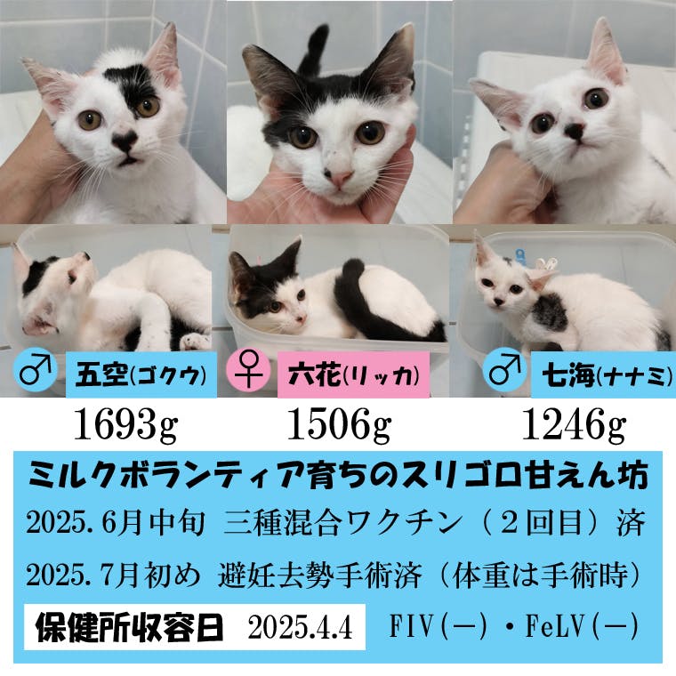 6月4日~7月21日まで預かった筆者は、7兄弟の残り3匹ということで漢数字を入れて、|五空《ごくう》、|六花《りっか》、|七海《ななみ》と呼んでいました。