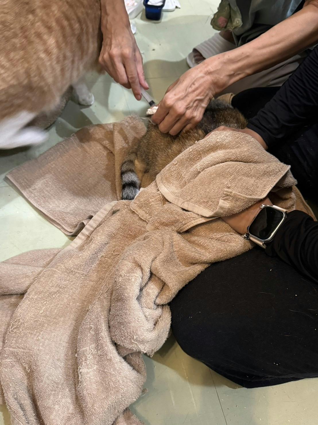 注射器を見るのも嫌な猫さんは、バスタオルで包まれての接種。