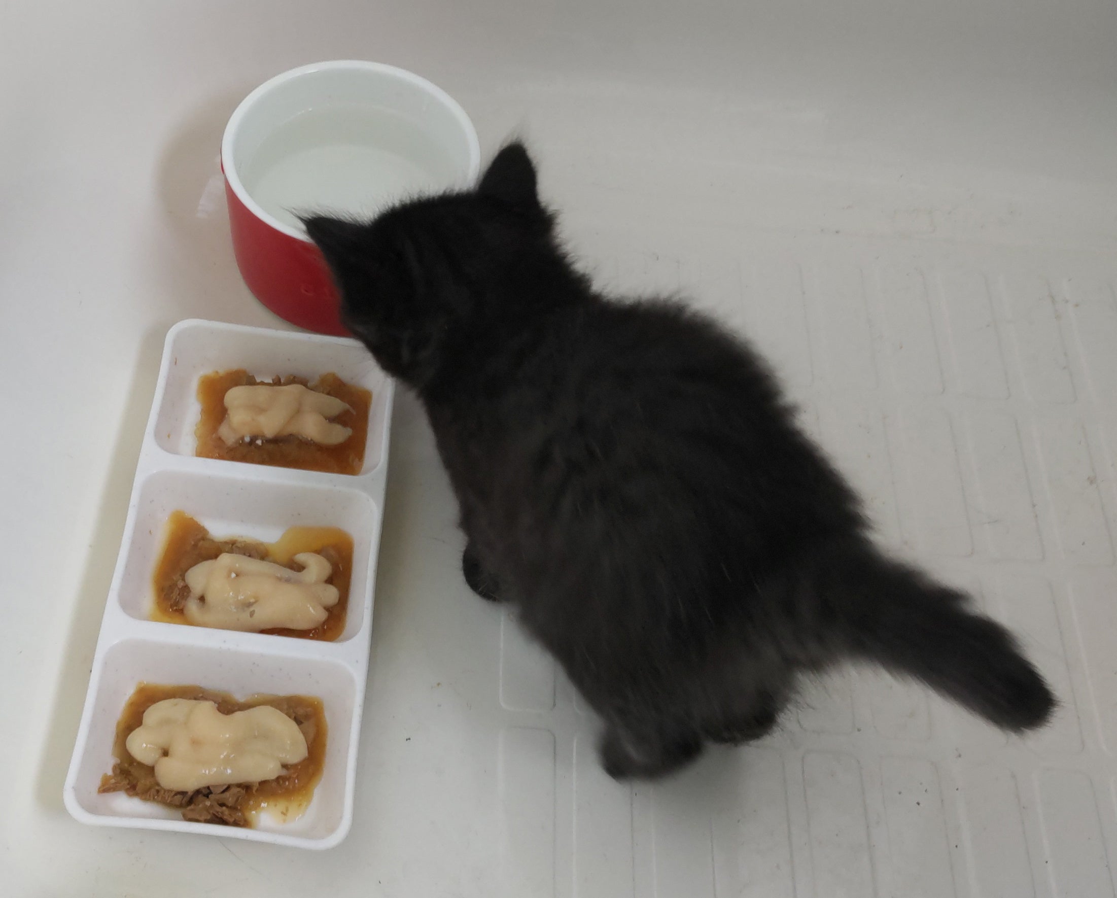 離乳食は仔猫用のドライフードをお湯でふやかすだけ。