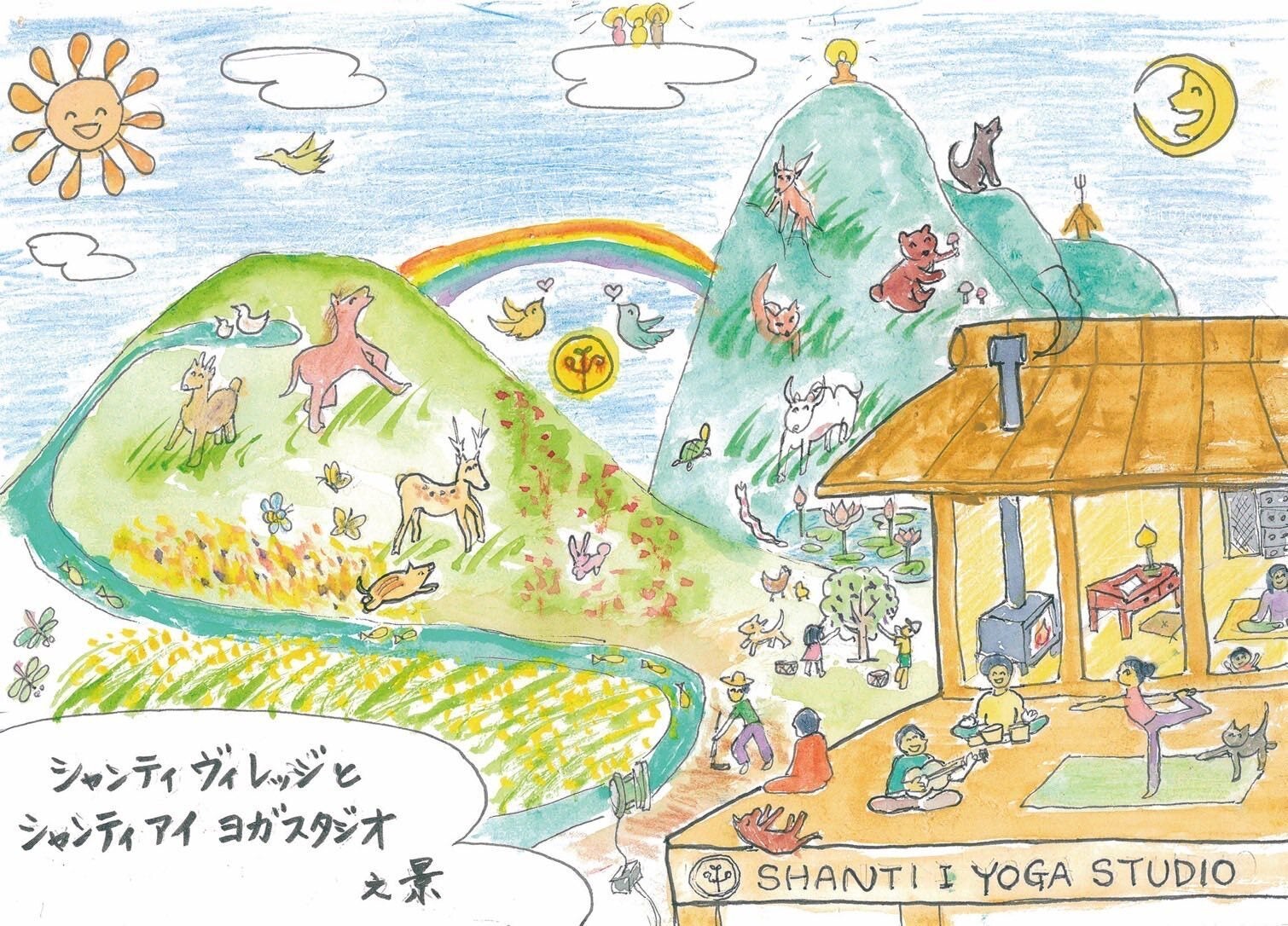 私はついに理想郷シャンティ・アイ・ヴィレッジを創りました。野生動物たちが棲み分けて生き生きと暮らす緑豊かな山。そこから湧き出る水が、魚たちの泳ぎ回る川となり、ふもとの田んぼに流れ、稲がたわわに実っています。山には果樹や木の実がたくさんあり、小鳥が集まってきて、かわいい声で歌っています。そんな山の麓に「シャンティ・アイ・ヨーガ・スタジオ」があります。自然と調和する日本家屋、見晴らしの良い広々とした庭。室内には音響設備も整い、音楽スタジオとしても利用できます。電源は川の水を利用した小水力発電。薪で調理し、薪ストーブで暖をとっています。この場所で、本来の自分に出会う旅を、MOMOがガイドします。伝統的ヨーガを学ぶことで、生きづらい人たちが幸せになり、その波紋が広がり、人の心も自然も豊かでおだやかになり、子どもたちや生きとし生けるものたちの未来がいつまでも幸せなものであることを願って、理想郷シャンテイ・アイ・ヴィレッジが生まれました。」