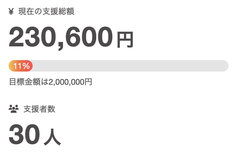3日目が終了し、これまでに30名の方からご支援をいただき、現在達成率11%、230,600円に到達しました!