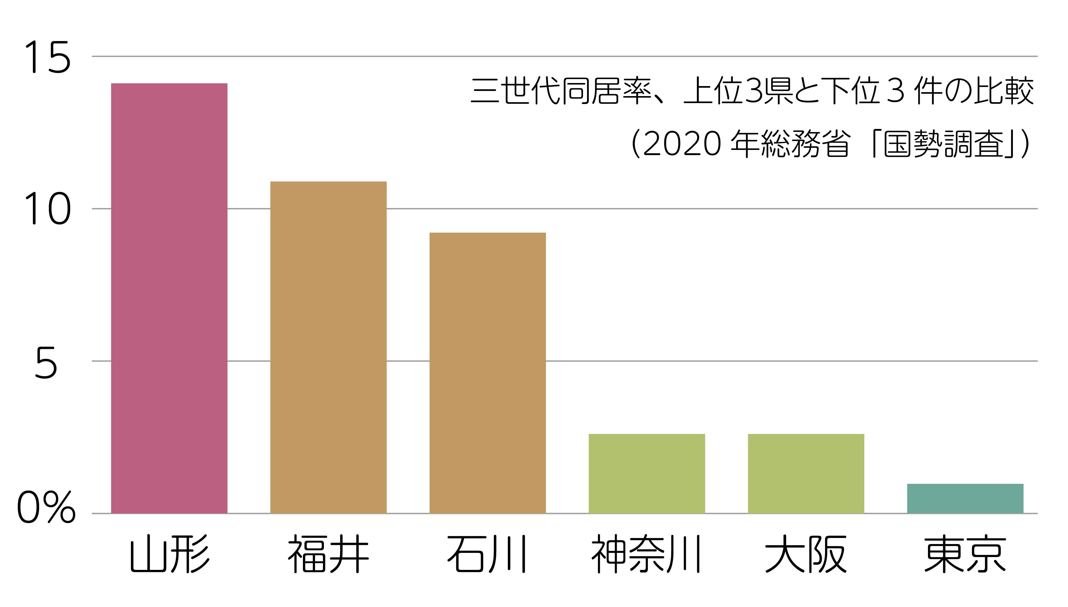 ・三世代同居率が約14%で全国1位の山形県(2020年総務省「国勢調査」)
