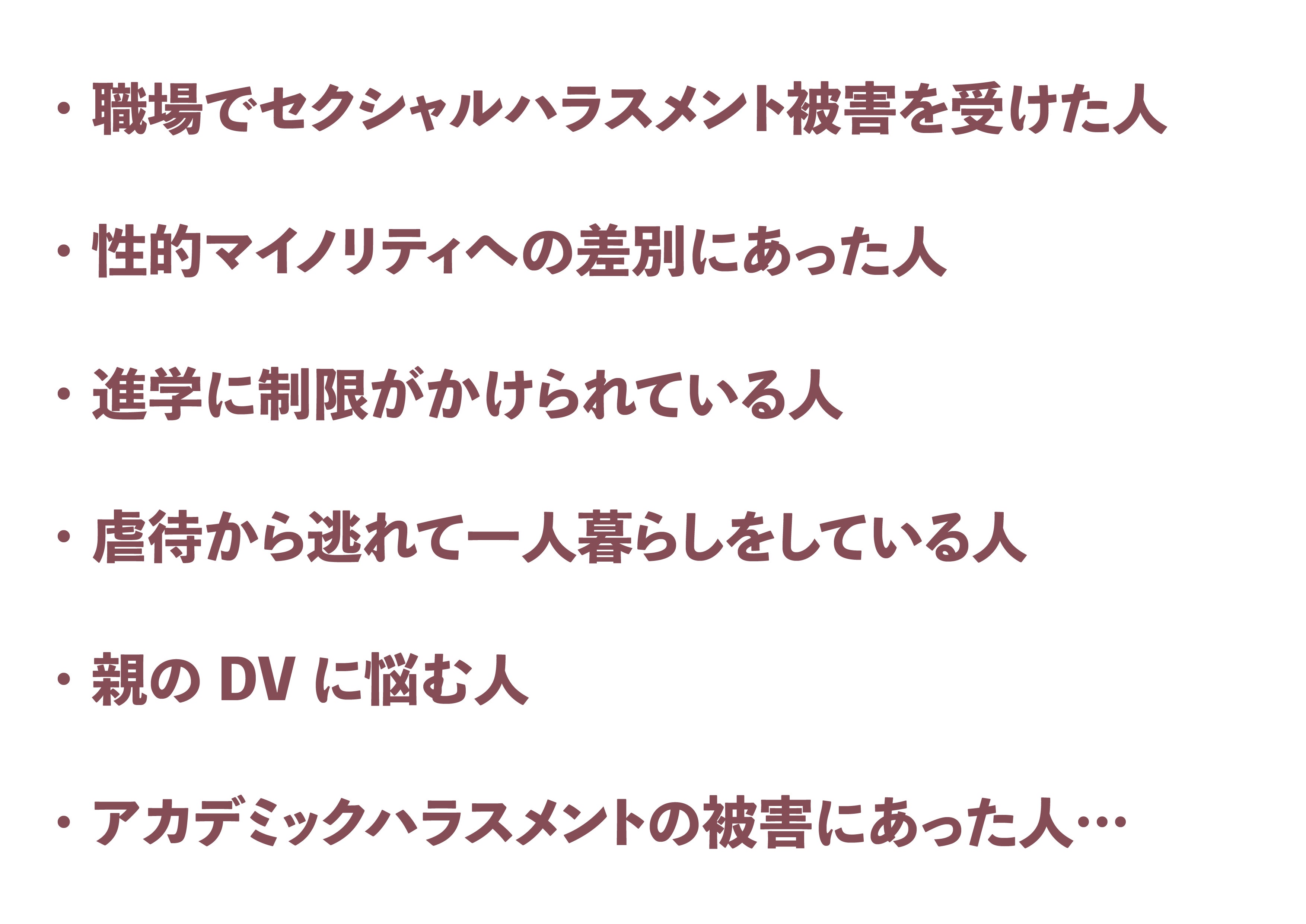 代表理事の小笠原が数年前、職場でのハラスメントの被害にあったとき、誰にも相談できず、とてもつらい思いをしました。